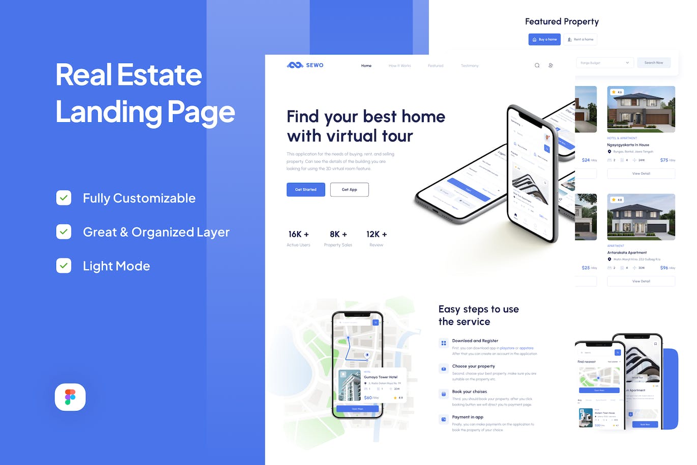 Sewo是一个具有干净、极简和现代设计的房地产应用程序登录页面。Sewo适合并易于完全定制,以满足您的需求。可在灯光模式下使用,在Figma中使用方便。