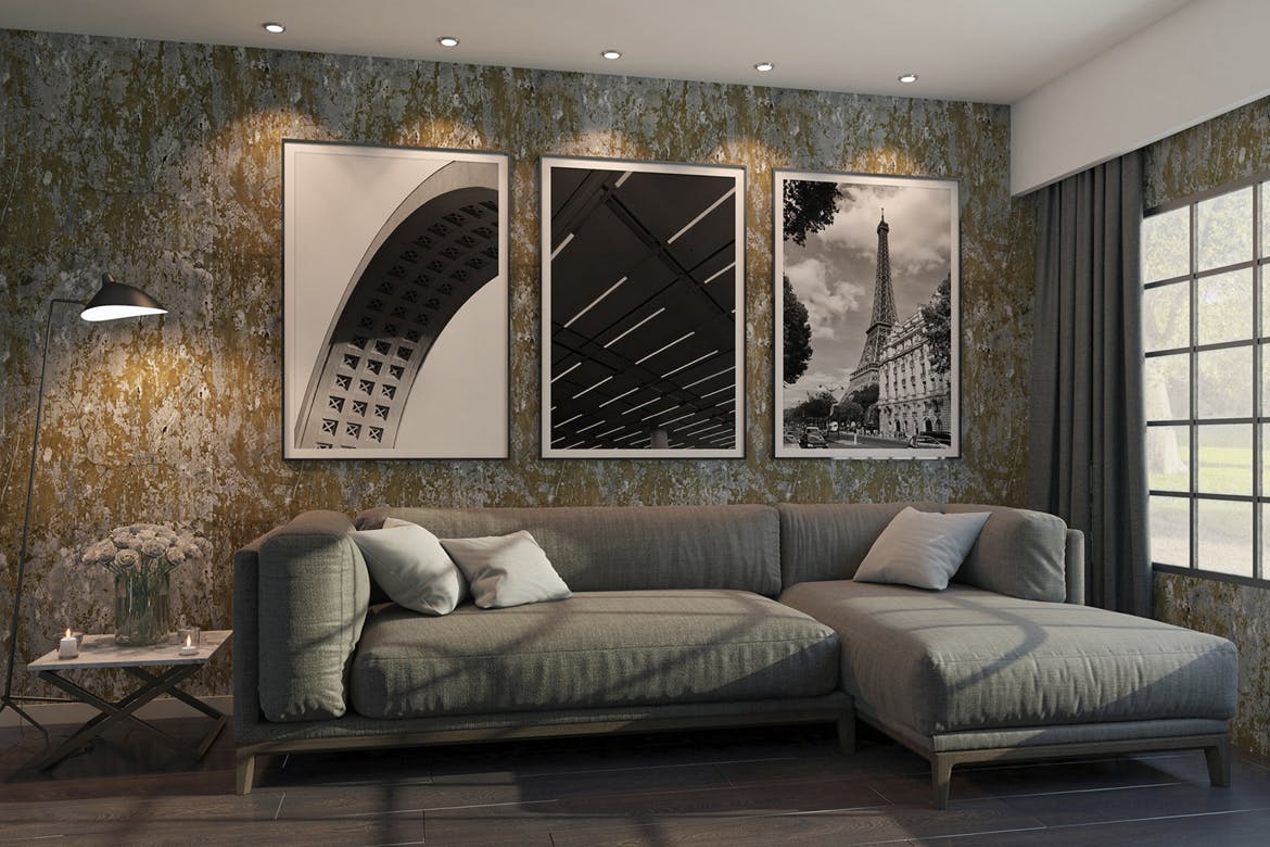 借助这种逼真的家居场景艺术作品展示样机,可以节省时间并使您的图像(照片,海报等)看起来很棒。使用智能对象可以轻松地将海报替换为您的设计,双击“智能层”,复制并粘贴图稿,保存即可完成!