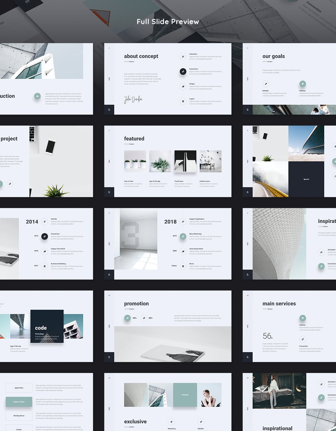 这次老不湿分享的是,高端简约时尚高品质的多用途powerpoint幻灯片演示模板(pptx),该模板的主要目的是为用户提供具有创意,现代设计和解决方案的想法。换句话说,模板是一种“产品”,买方可以直接使用它,并且可以在没有模板作者的情况下流畅地表达自己的想法。