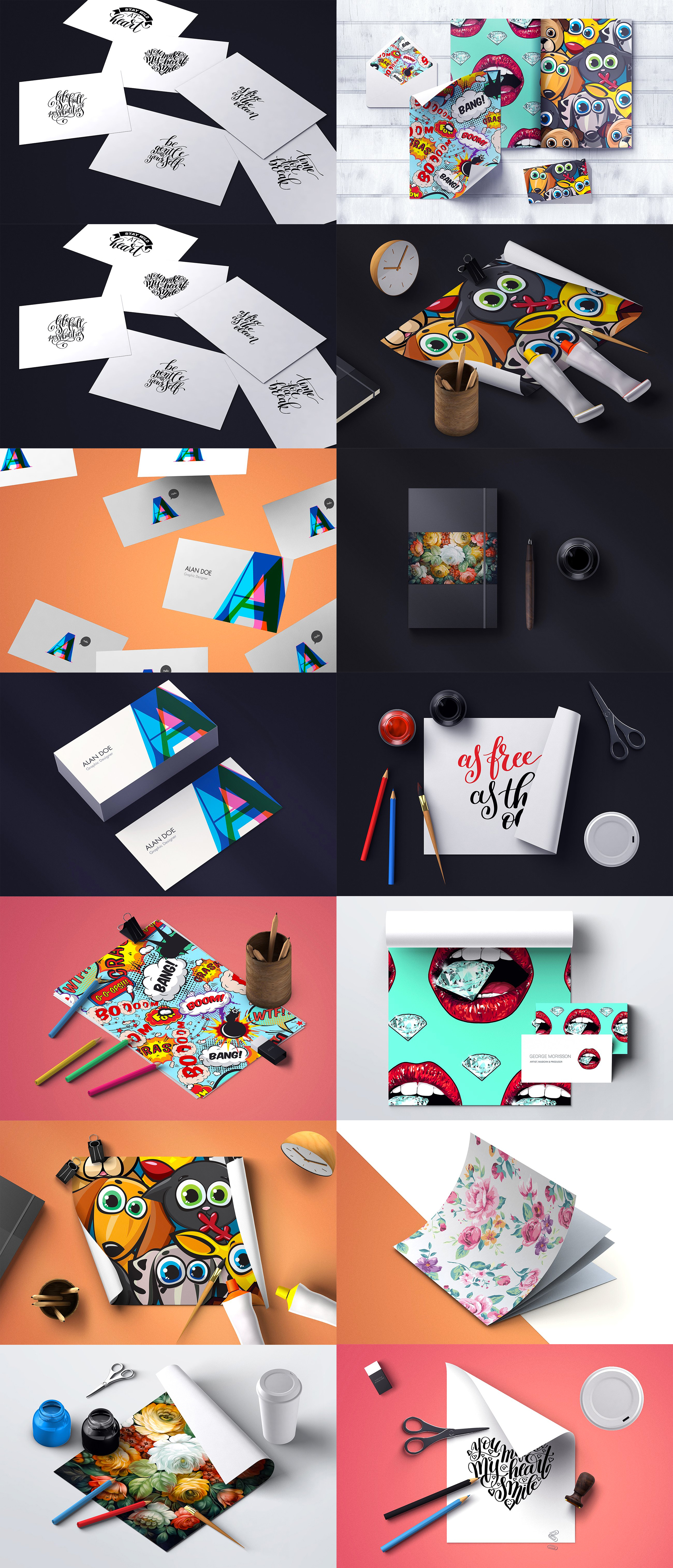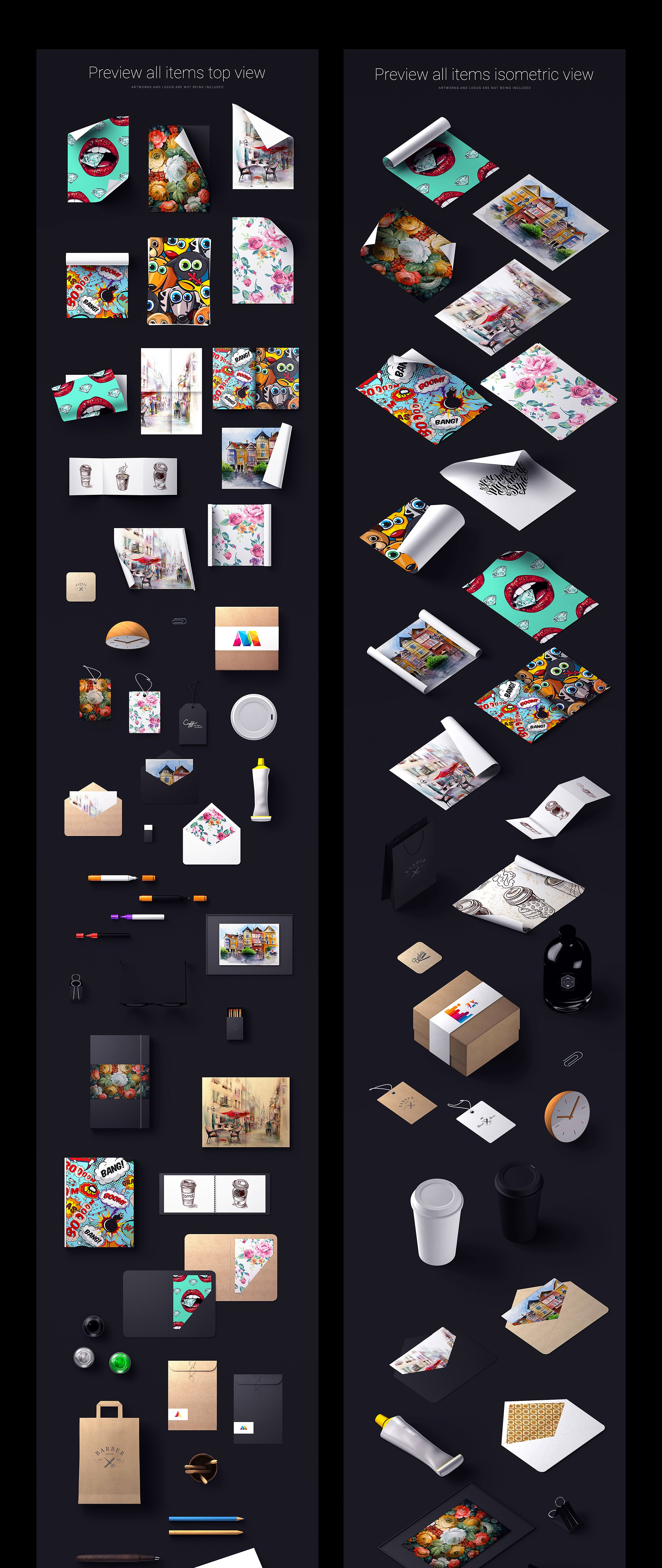 这组惊人的145种元素,50种预制的场景、背景和效果为您的设计作品创建了精美的展示!只需双击名为“替换”的图层,粘贴您的图稿或徽标类型,然后点击保存!包括顶视图和等轴测视图中的高分辨率图像。所有文件都易于编辑并且与Photoshop兼容。