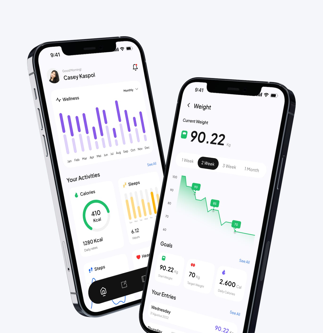 Helti是一款健康追踪手机应用。它具有仪表板功能、步骤和重量跟踪器。此文件包括3个屏幕的移动应用程序。这是一个专业而现代的模板。文档齐全,易于定制。在Figma文件中提供。