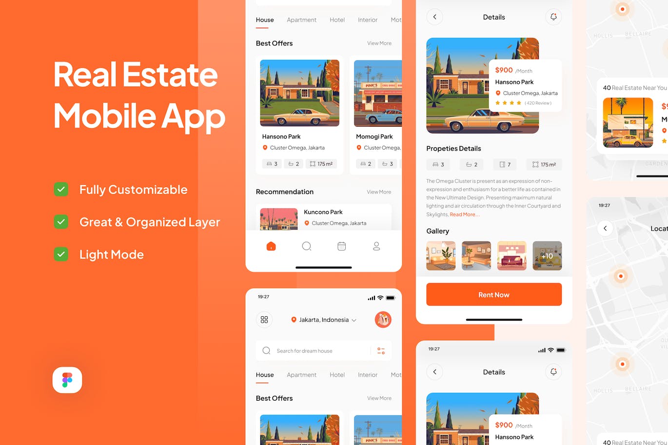 房地产移动应用程序采用干净、极简和现代的设计。这是适合的,易于完全定制以满足您的需求。可在灯光模式下使用,在Figma中使用方便。
