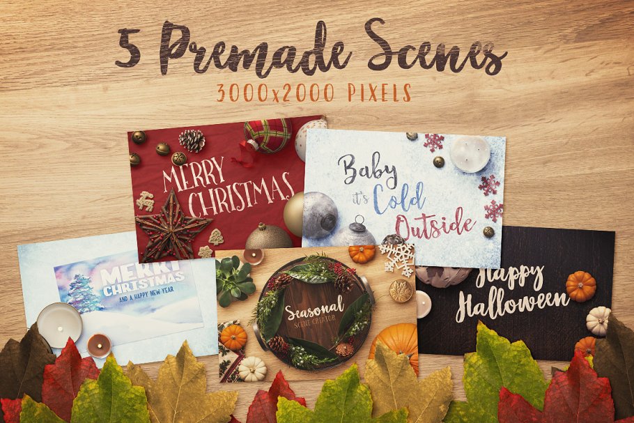 这组合集包括了62个独立的物体,5个预制场景和5个高分辨率背景纹理。让你可以更快速轻易地创建万圣节,感恩节,圣诞节等更多的节日主题的场景,你也可以轻易的预制的场景和定制文本。
