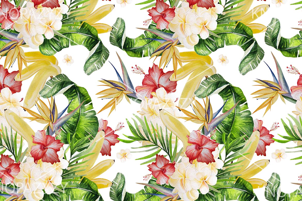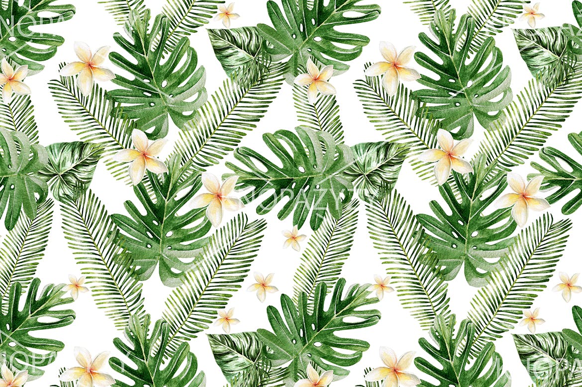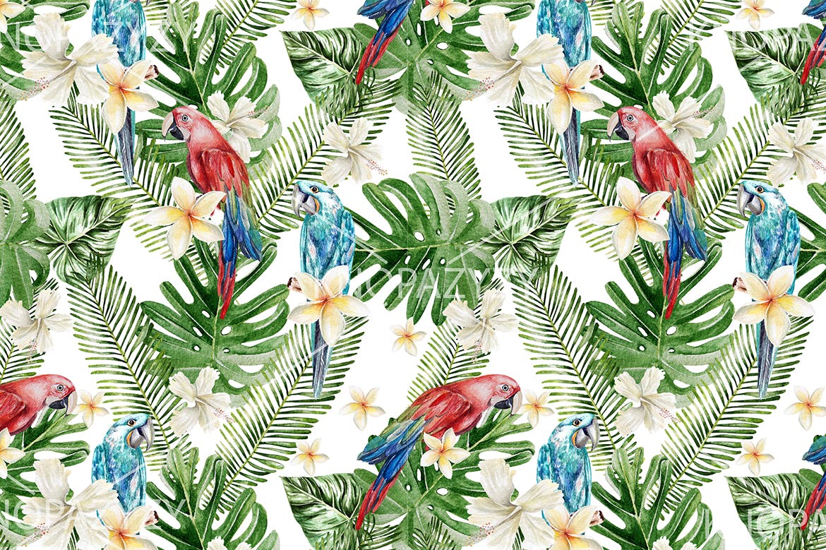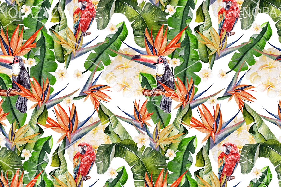明亮多汁的水彩热带树叶、花朵、鸟类。火烈鸟、巨嘴鸟、鹦鹉、凤头鹦鹉。16个带图案的PNG文件(透明背景),16 个 JPEG 格式的文件,白色背景 (4167×4167) 300dpi。