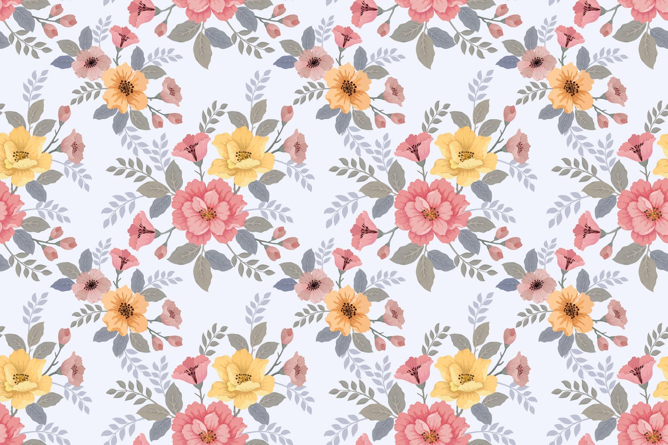 美丽的花朵和叶子无缝图案。这种无缝图案适用于织物、纺织品、礼品包装、壁纸、背景、背景或任何您想根据您的创造力创造的东西。