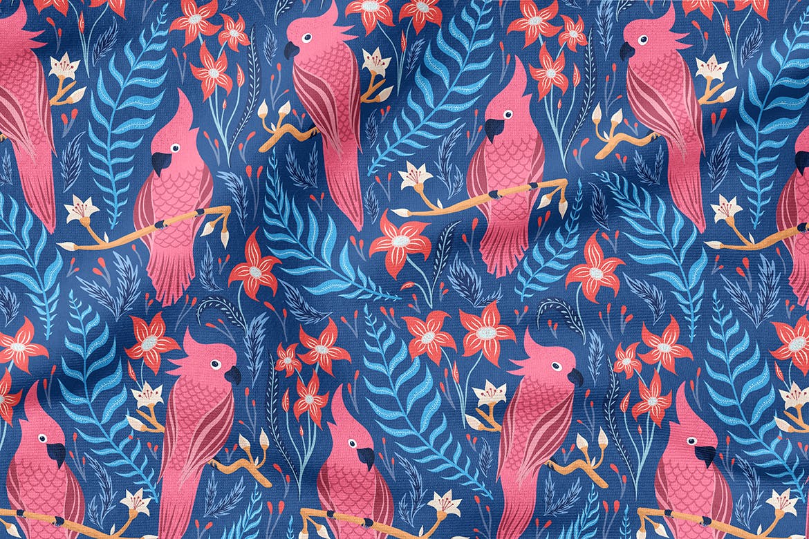 无缝热带图案与鸟类。五颜六色的鹦鹉在热带树枝上,叶子和花朵在黑暗中。手绘矢量图案。