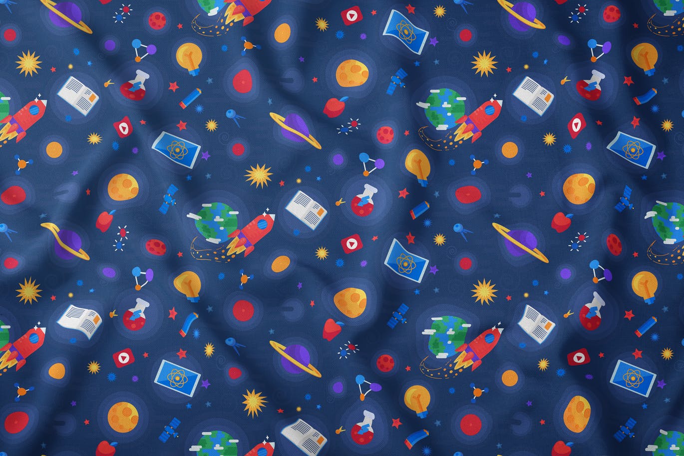 知识宇宙无缝图案包含宇宙空间矢量中的飞行火箭航天器,带有宇宙空间元素和时尚扁平风格的铅笔、苹果、书籍、平板电脑、灯、视频和化学烧瓶等学校符号。知识和教育宇宙星系矢量背景。研究和发现空间壁纸。飞行火箭和卫星、行星和恒星、教育书籍和实验室烧瓶。平面卡通背景插画。学校在线教育课程装饰品。在线课程、互联网学习和培训的远程教育。化学和物理、文学和数学课。学习时间平面卡通插图。在宇宙空间飞行火箭航天器矢量。宇宙穿梭机和卫星设备在宇宙背景下飞行。行星、月亮和星星。探险家和发现星系装饰品。