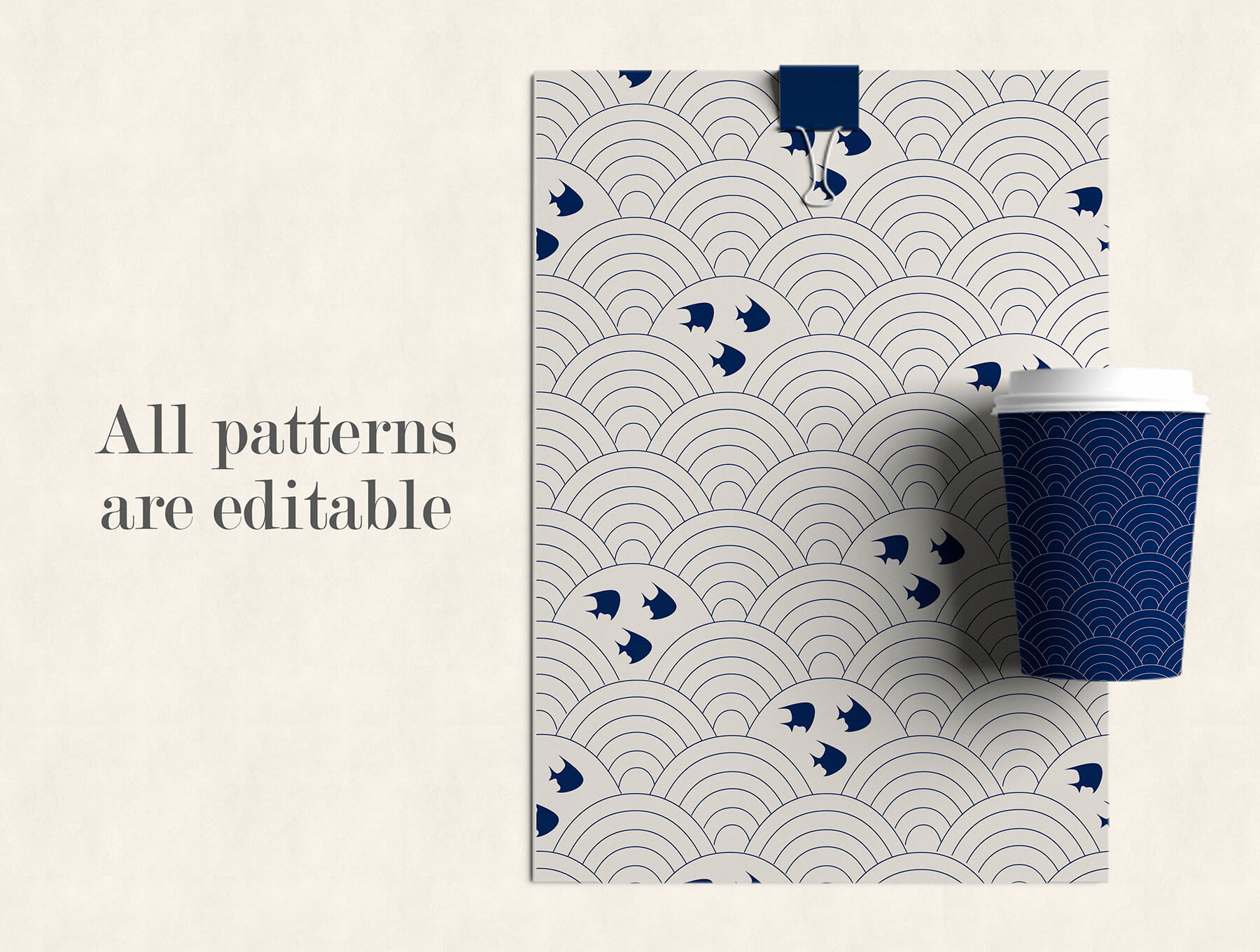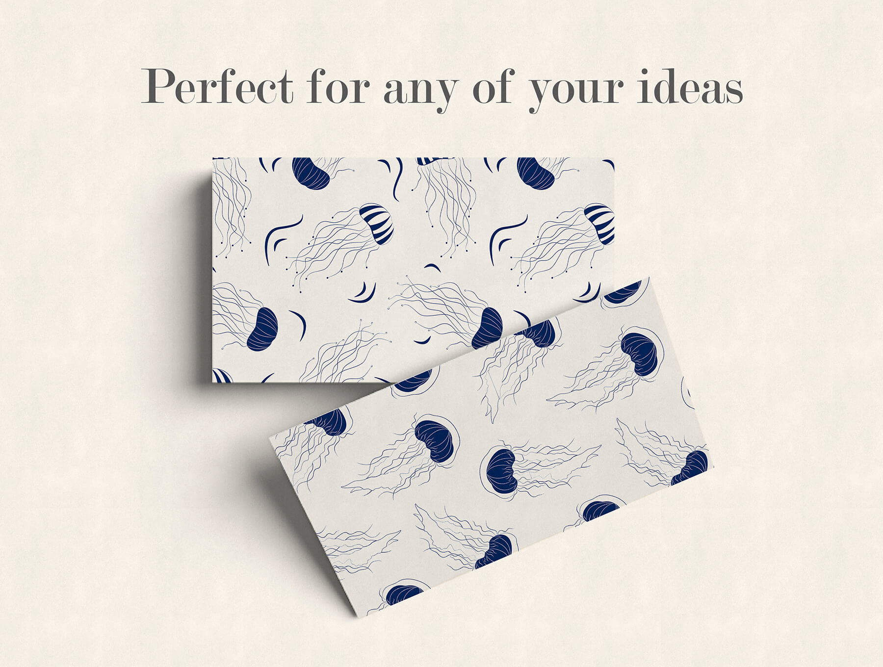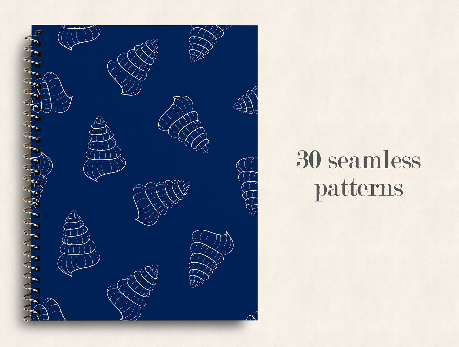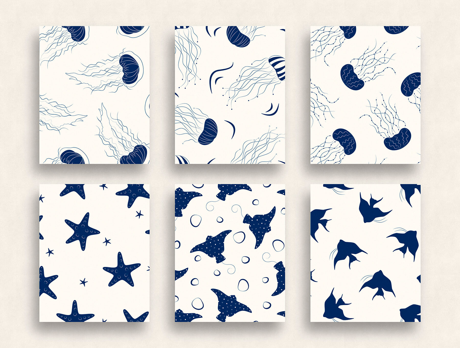 30 种海洋无缝矢量图案的精美集合。这些模板非常适合品牌、包装、印刷产品、壁纸、纺织品等。您还可以更改矢量文件中图像的颜色和大小。