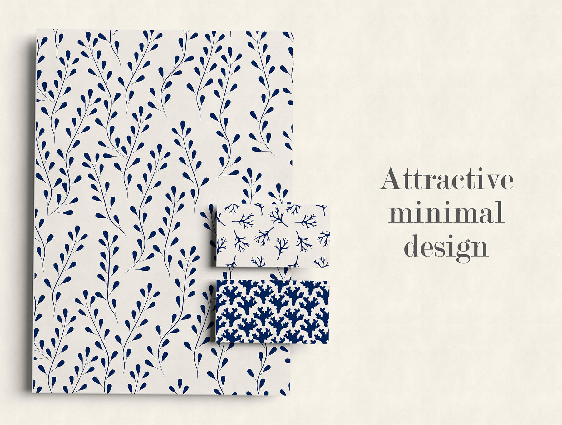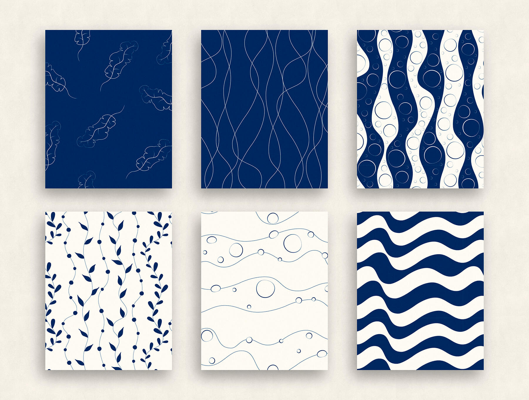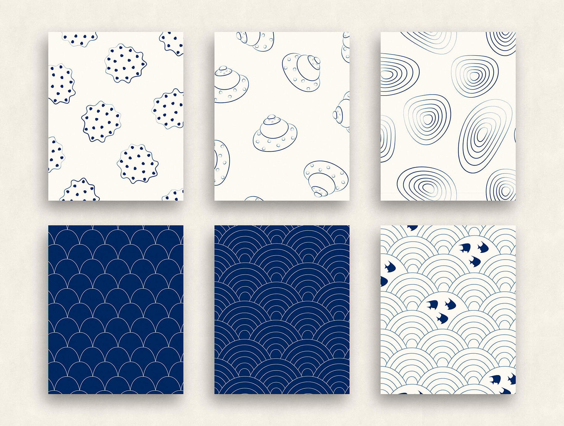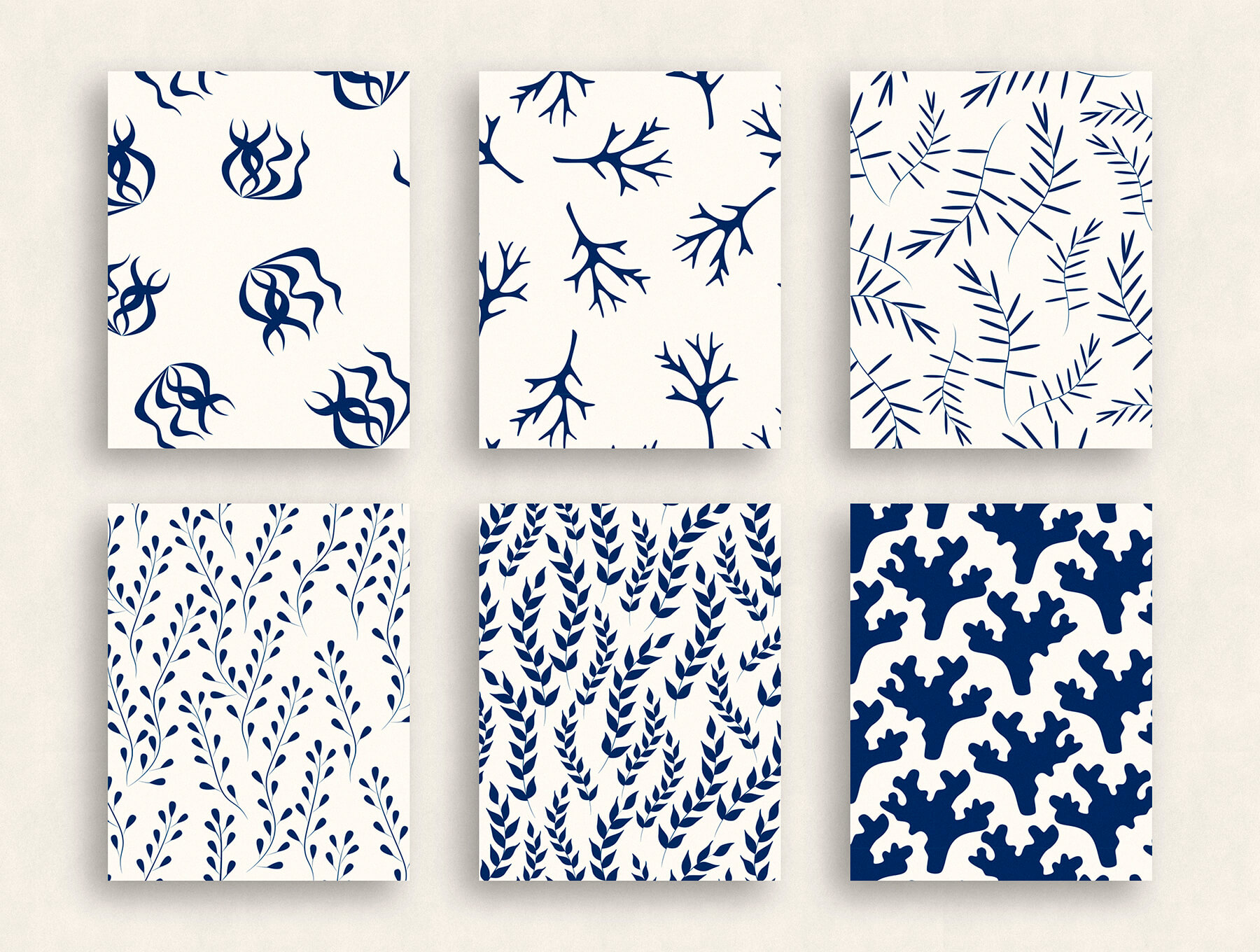 30 种海洋无缝矢量图案的精美集合。这些模板非常适合品牌、包装、印刷产品、壁纸、纺织品等。您还可以更改矢量文件中图像的颜色和大小。