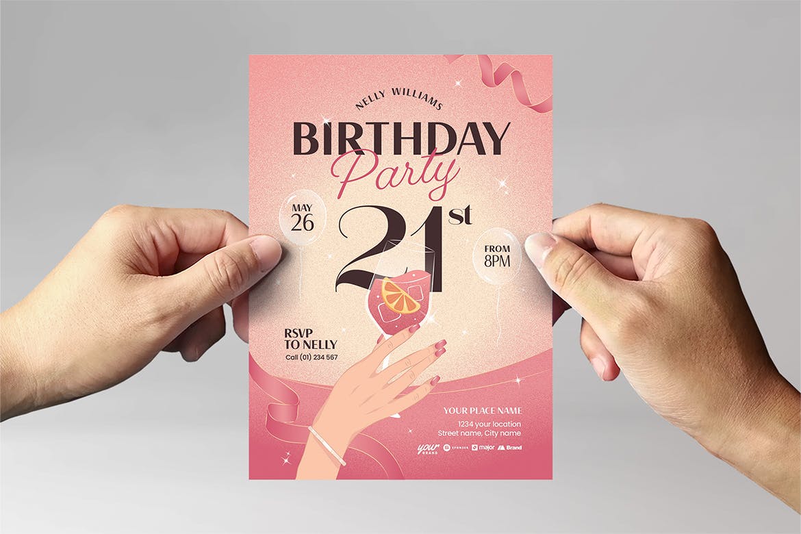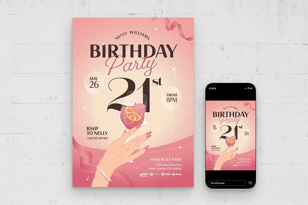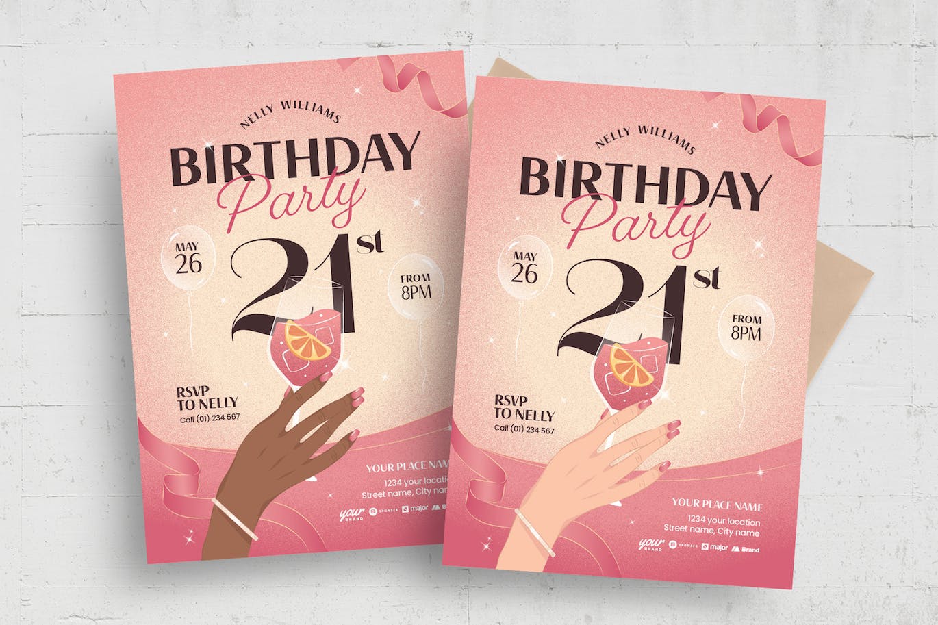 如果您正在为您的下一个平面设计项目寻找女性化的生日聚会请柬或传单模板,那么这款粉色生日聚会传单很容易编辑和定制。插图描绘了卡通庆祝欢呼与手中的酒。