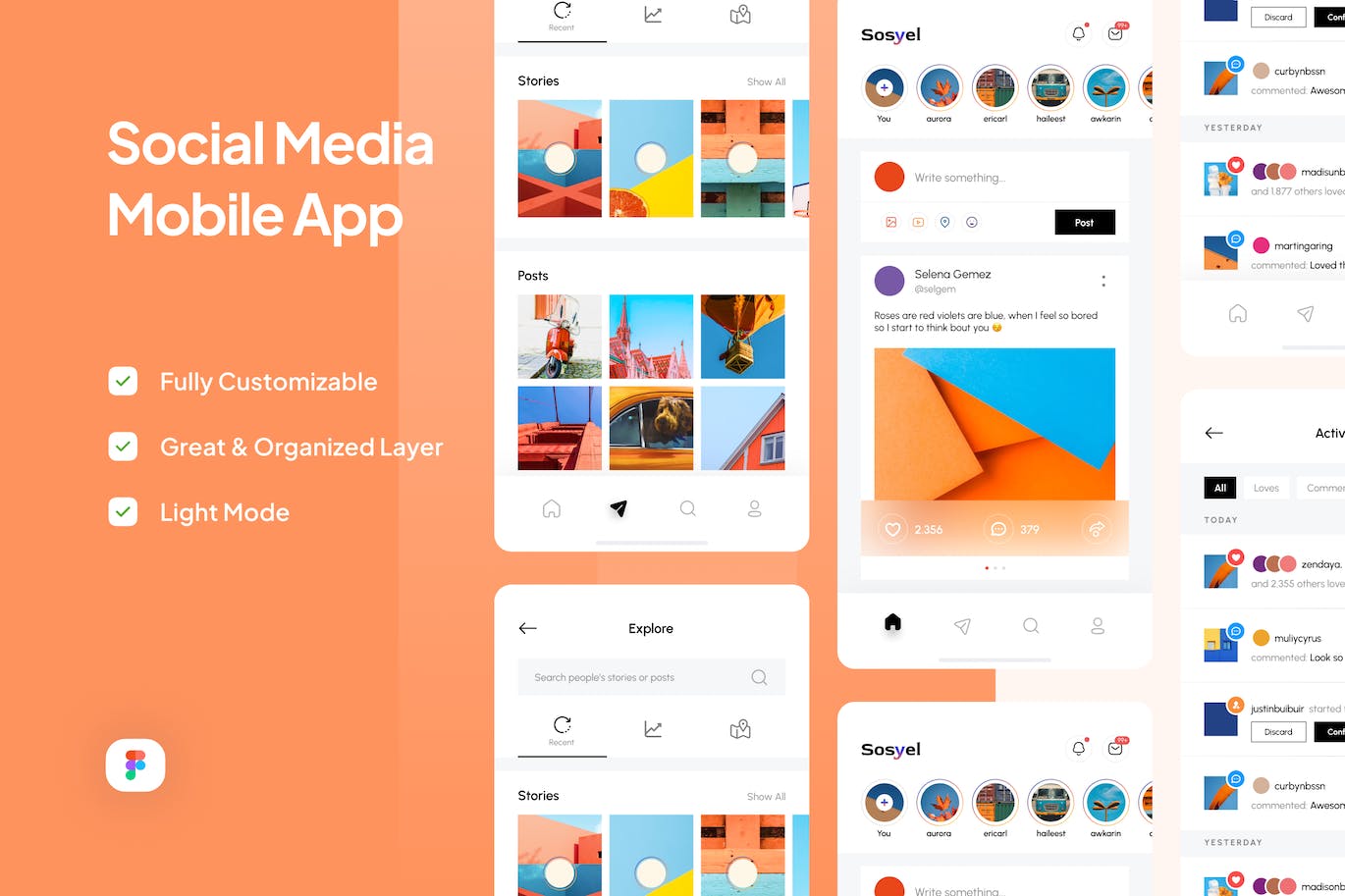 Sosyel是一款具有简洁、极简和现代设计的社交媒体移动应用程序。Sosyel适合并易于完全定制,以满足您的需求。可在灯光模式下使用,在Figma中使用方便。您可以获得包含以下内容的高质量屏幕: