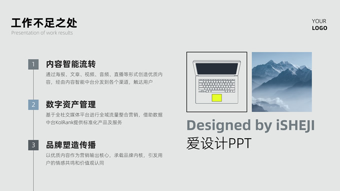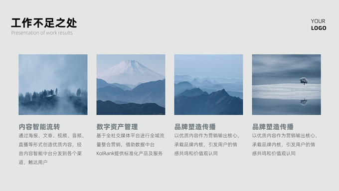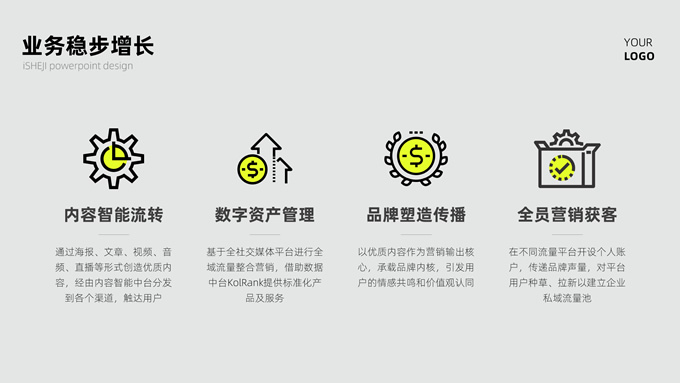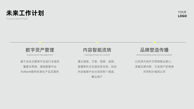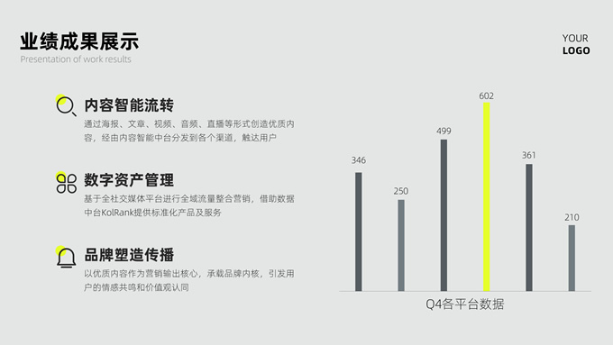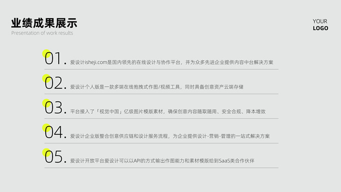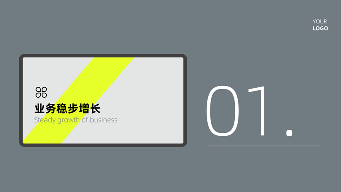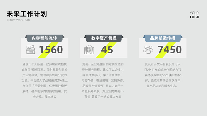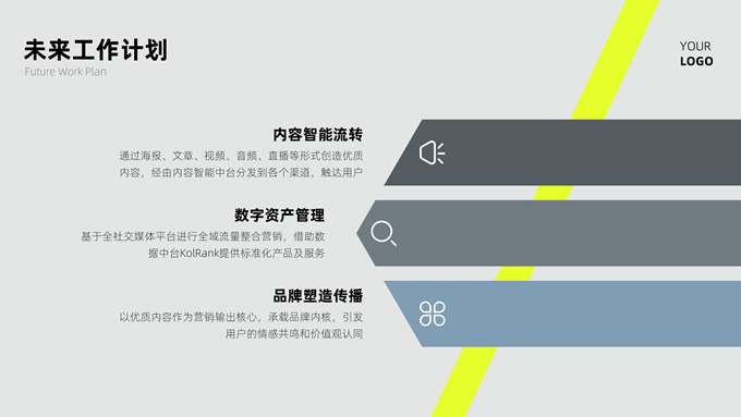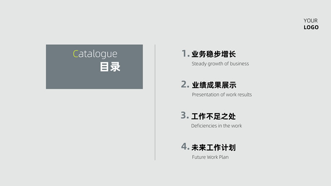 简介:简约时尚销售部年度工作总结ppt模板,本模板共20P,目录:业务稳步增长、业绩成果展示、工作不足之处、未来工作计划,极简几何元素卡片式风格创意封面、过渡页,酸橙灰配色,完整内容框架极简商务风小清新版式内容页,适合销售部工作汇报、工作总结等场景应用的商务通用ppt模板。