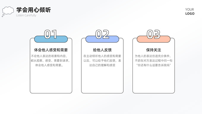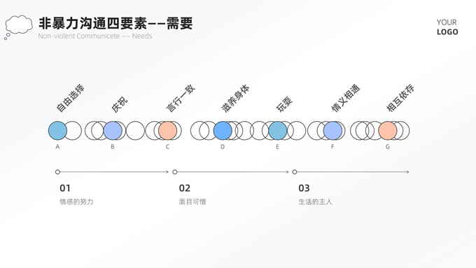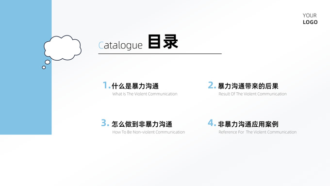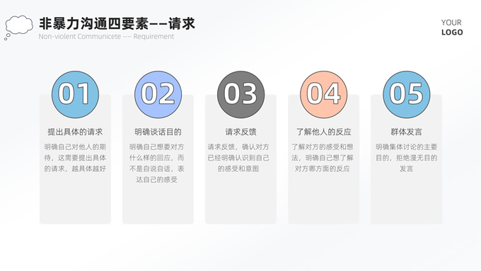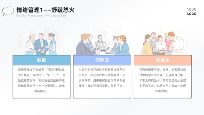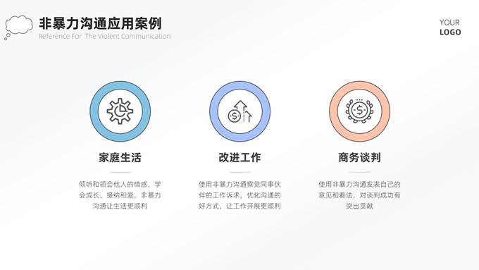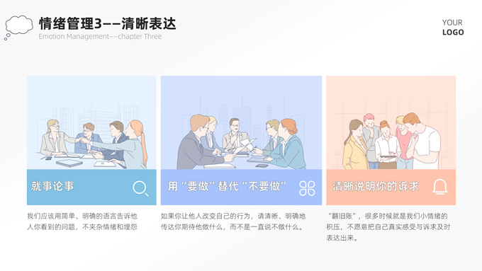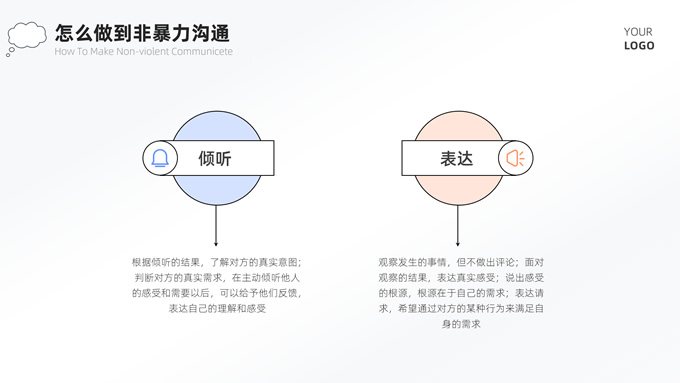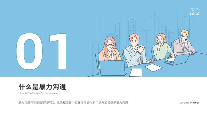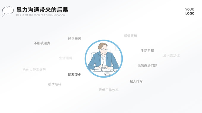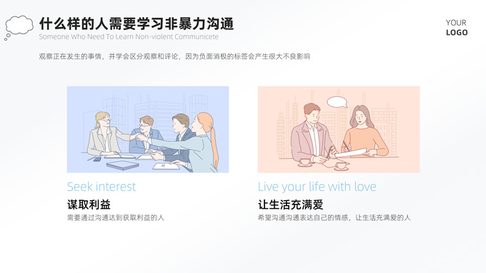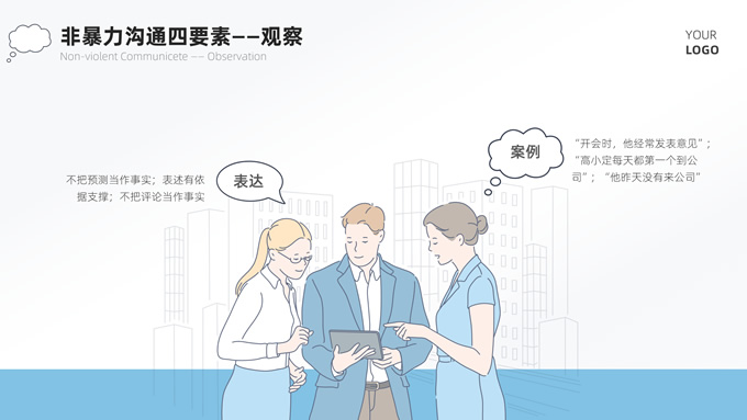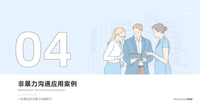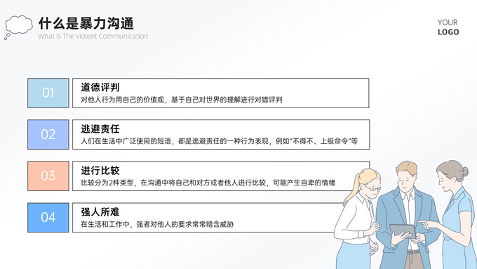 简介:插画风人际关系和沟通技巧商务培训ppt模板,本模板共21P,目录:什么是暴力沟通、暴力沟通带来的后果、怎么做到非暴力沟通、非暴力沟通应用案例,商务办公场景插画主图标题文字简约封面、过渡页,完整内容框架淡雅清新商务版式内容页,适合商务沟通、人际关系处理等场景应用的商务培训ppt模板。