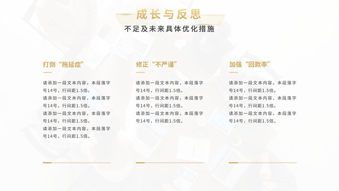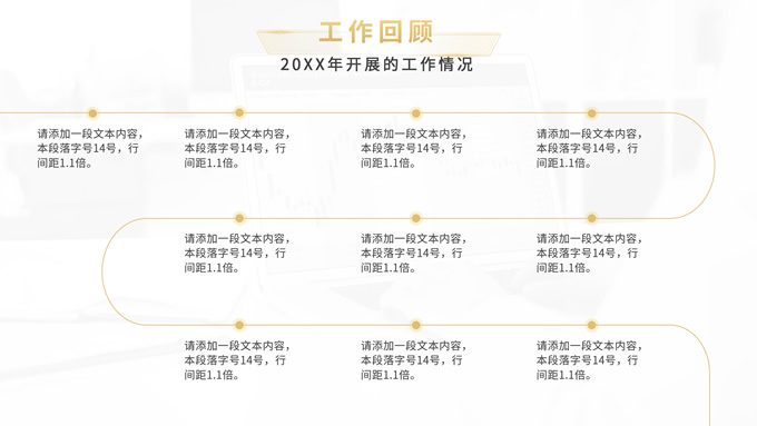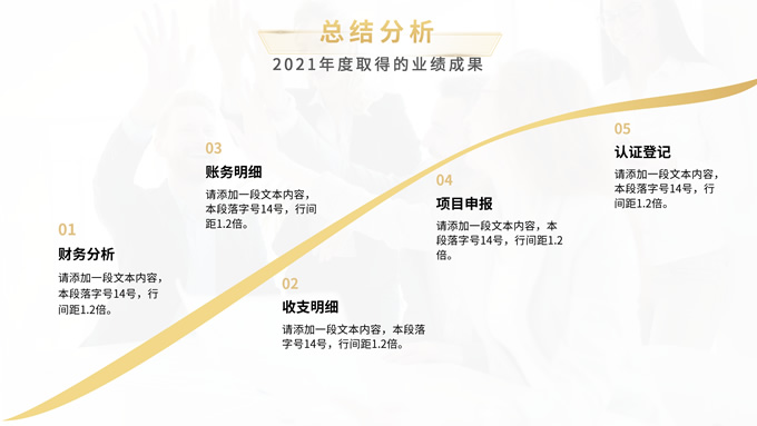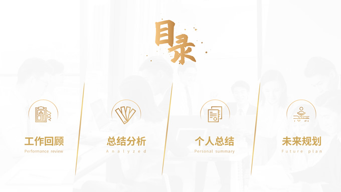简介:白金商务财务工作年终汇报ppt模板,本模板共10P,包含了封面页,目录页,过渡页,逻辑图示,内容页,图表页,尾页等几种版式,财务是个平时关注不多但却是一个极其重要的岗位,而低调奢华的白金就很契合这种职业的气质,在数据的体现方面我没有做传统的表格而是用条形图和圆环表示出来了,对于重点的地方另有标注,这样数据的重点就自然的暴露出来了,希望模板中的配色与元素能带给你一些灵感,P界达人 落西 作品。