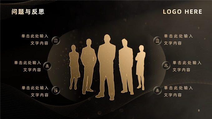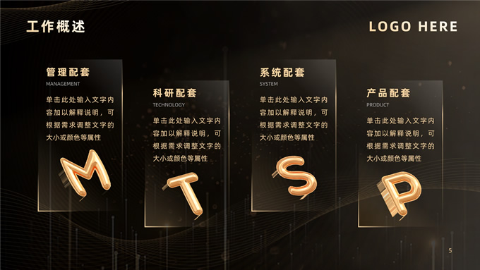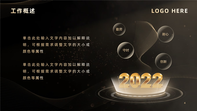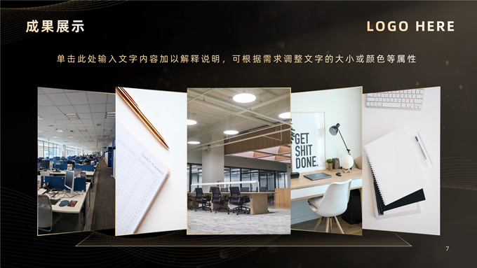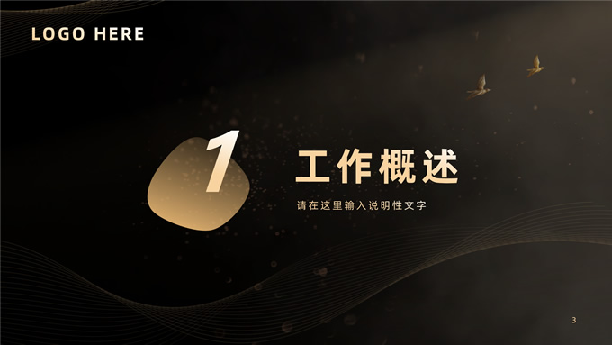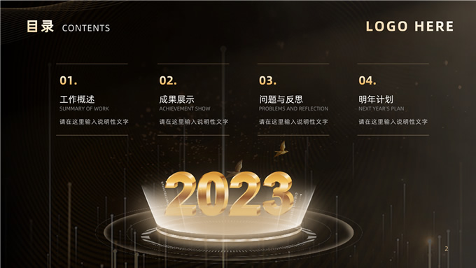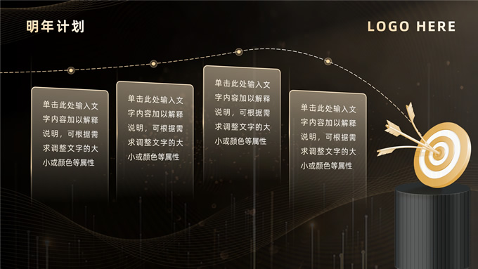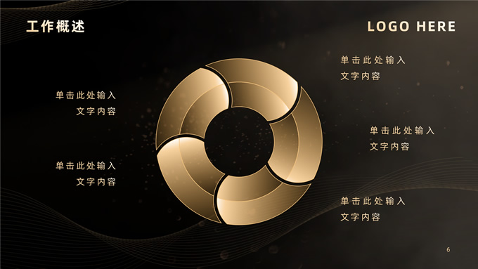 简介:简洁大气黑金风年终总结ppt模板,本模板共11P,主要使用黑金配色,表现出业绩辉煌、成绩斐然的气势;整体设计简约,无复杂的修饰,涵盖多种实际工作中使用到的逻辑关系,适合用于年终总结内部汇报、个人业绩展示及新年计划等场合,P届达人 CB 作品。