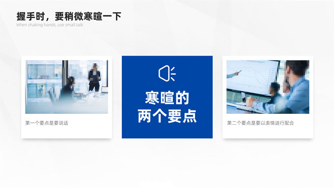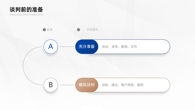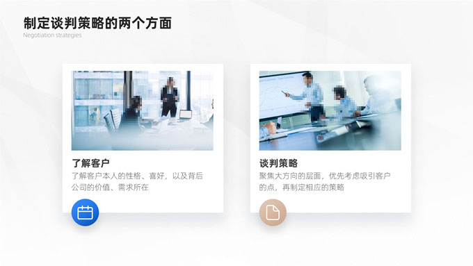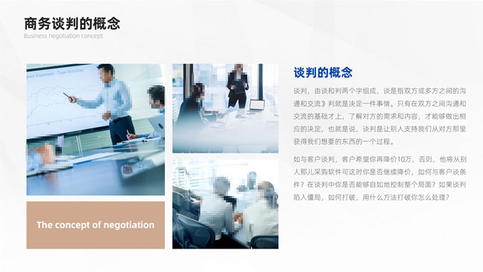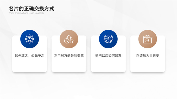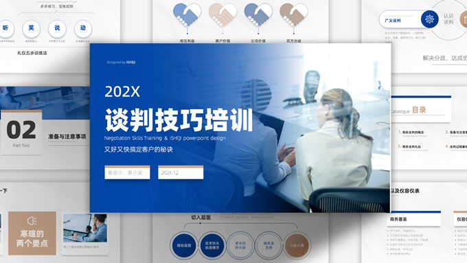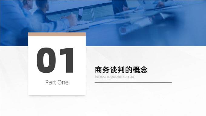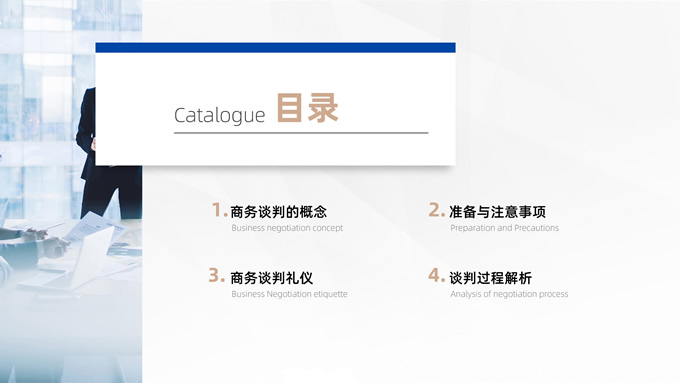简介:谈判沟通技巧培训商务培训ppt模板,本模板共19P,目录:商务谈判的概念、准备与注意事项、商务谈判礼仪、谈判过程解析,商务大图背景渐变遮罩创意标题文字封面,卡片式风格目录页、过渡页,蓝金配色,简约阴影风格完整内容框架商务版式内容页,适合沟通技巧培训等场景应用的商务培训通用ppt模板。