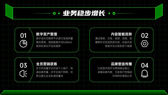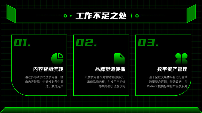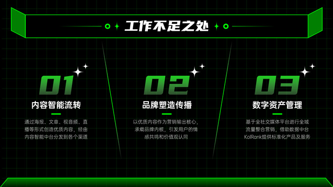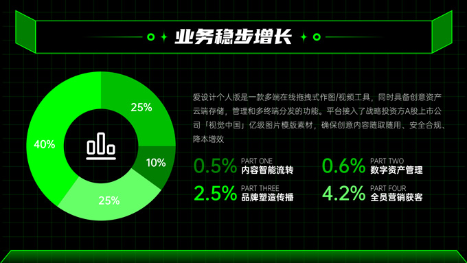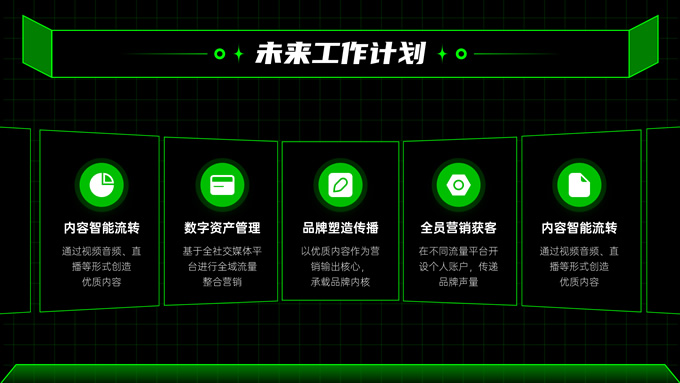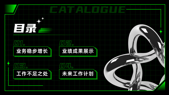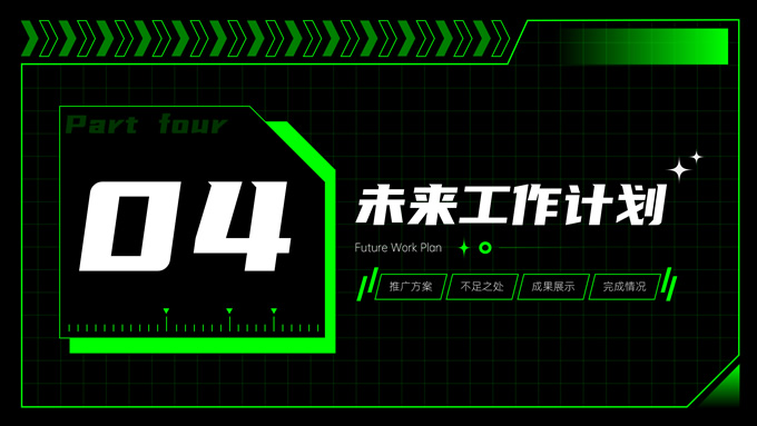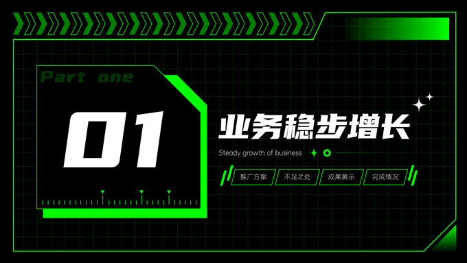 简介:绿黑炫酷酸性风总结汇报商务通用ppt模板,本模板共20P,目录:业务稳步增长、业绩成果展示、工作不足之处、未来工作计划,几何图形线条酸性元素创意封面、目录页、过渡页,绿黑配色,炫酷简约酸性风格商务版式内容页,适合工作汇报、工作总结、工作计划等场景应用的商务通用ppt模板。