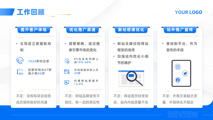 简介:简约蓝色系年终述职报告ppt模板,本模板共10P,商务风,由往期改稿作品延伸成模板,整体色调为蓝色系,颜色搭配统一,整体设计简约,无复杂的修饰,该作品涵盖多种实际工作中使用到的逻辑关系,适用于各种商务工作汇报场景,版式方便设计修改,P届达人 CB 作品。