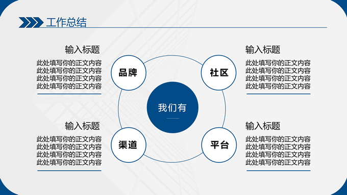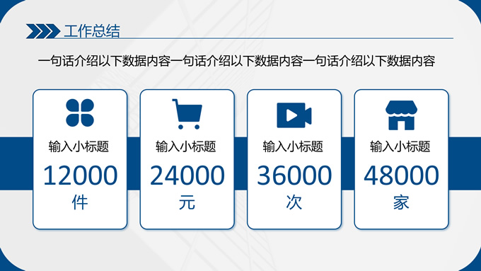 简介:蓝色简约商务年终汇报总结ppt模板,本模板共13P,整体采用蓝色简约风格,目录页、过渡页、多段内容页、数据页、合作伙伴页、时间轴页,极简约版式内容页,支持一键换色和更换字体,适合商务工作计划、企业工作汇报、工作总结等场景应用的商务通用ppt模板,P界达人 MF 作品。