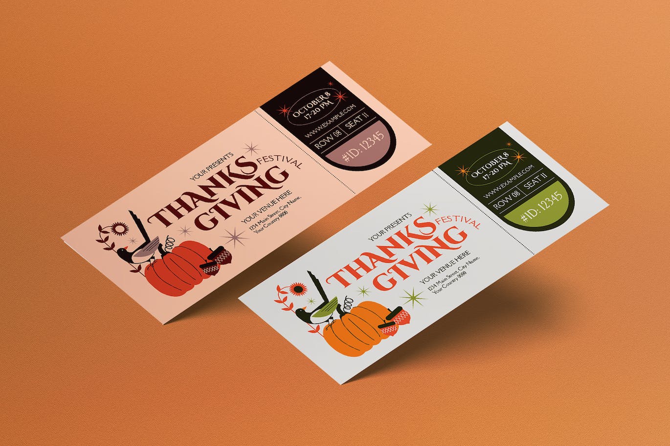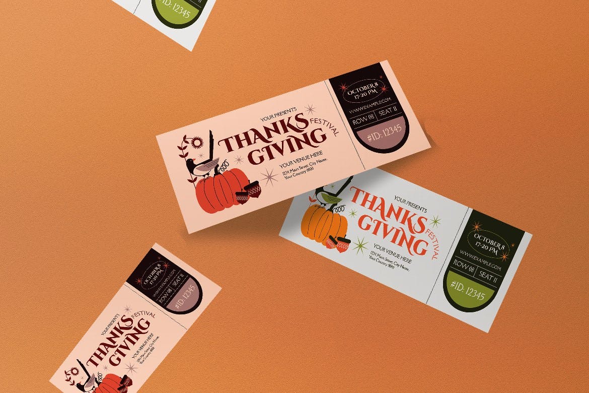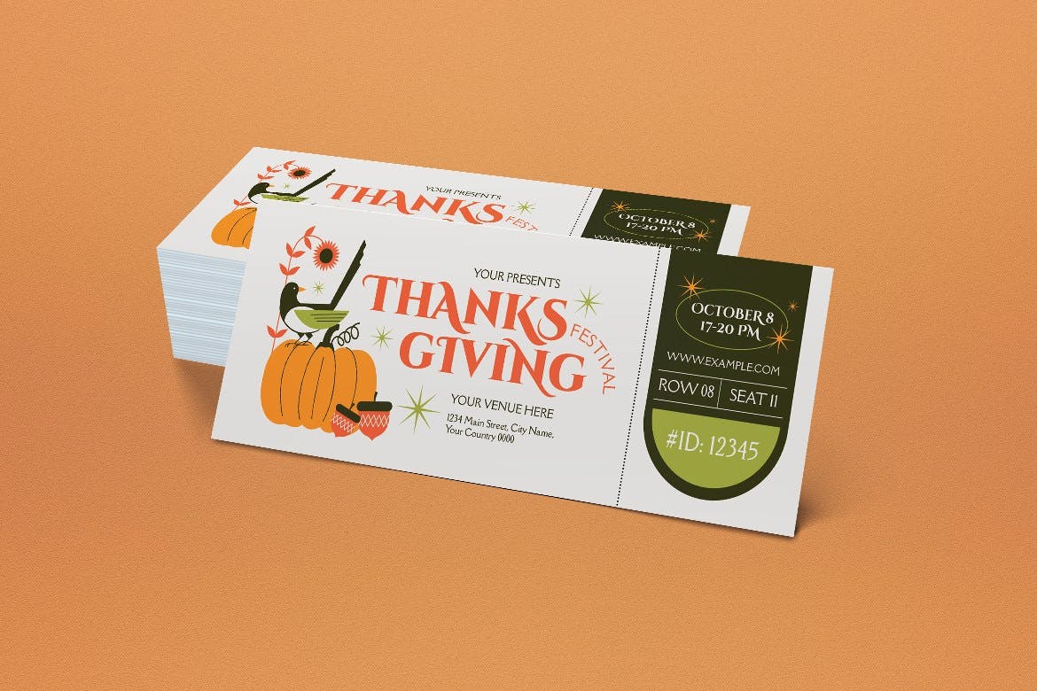 这次老不湿分享的是,清新简约时尚感恩节门票入场券设计模板-AI,PSD,所有模板都易于使用组织良好的文件进行自定义。