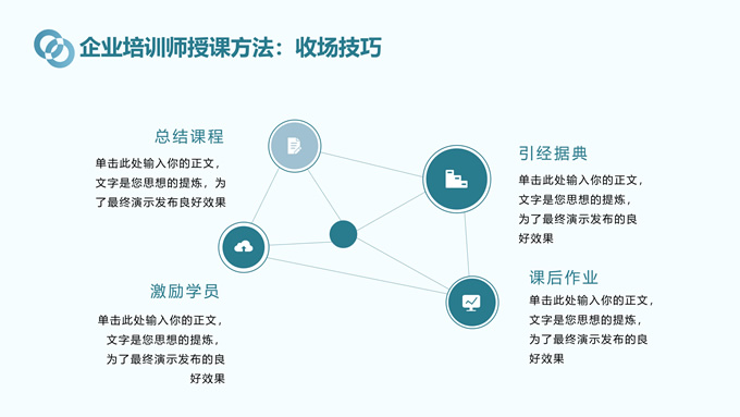 简介:青蓝色扁平几何风企业培训ppt模板,本模板共15P,以青蓝色为主题,风格简约活泼又不失大气,色彩灵动且清晰,本作品包含封面页、目录页、标题页、内容页以及尾页,可用于企业内部培训、各行业公司培训师能力提升以及其他商务汇报等多元场景,场景丰富,用途广泛,P界达人 林夕 作品。