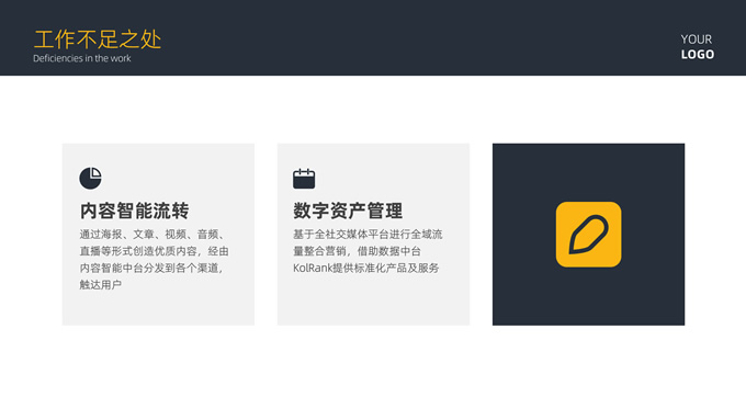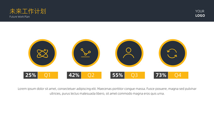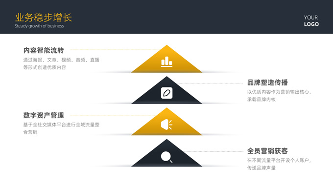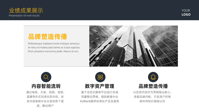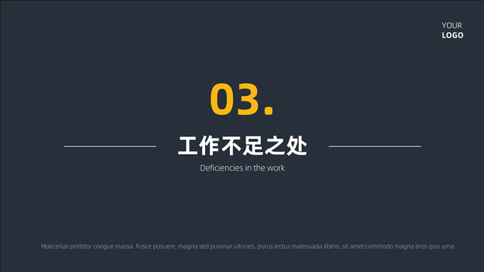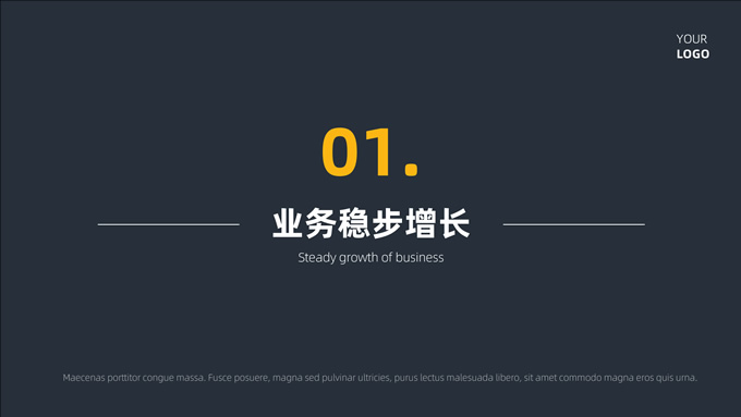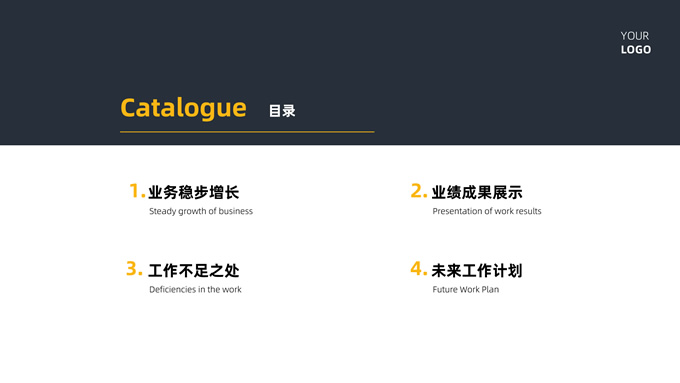 简介:简约国际范年终述职个人总结汇报ppt模板,本模板共20P,目录:业务稳步增长、业绩成果展示、工作不足之处、未来工作计划,简约几何国际范标题文本封面、目录页、过渡页,金灰配色,扁平化图表,完整框架欧美风版式内容页,适合年终述职、个人总结汇报等场景应用的欧美国际范商务通用ppt模板。