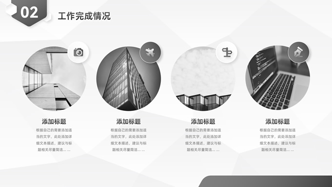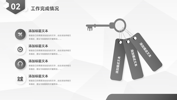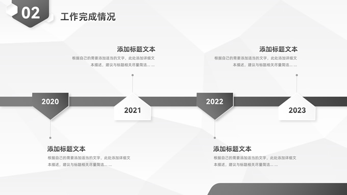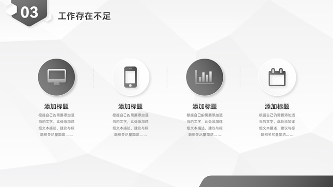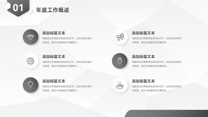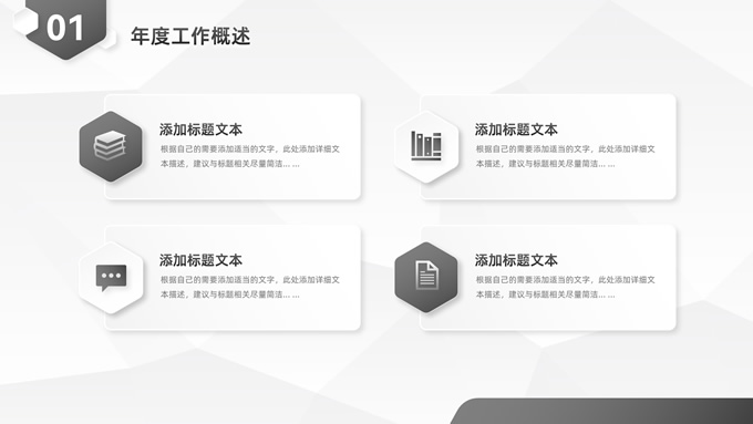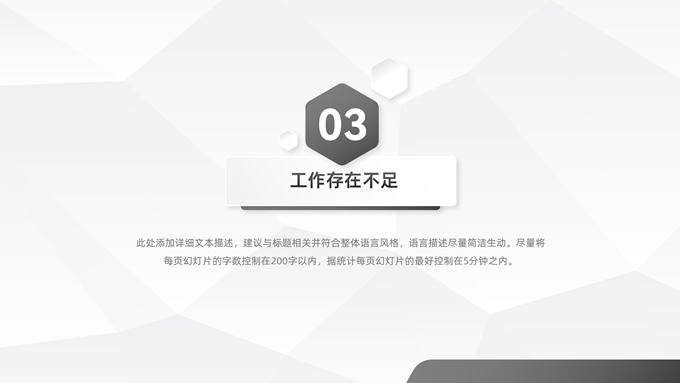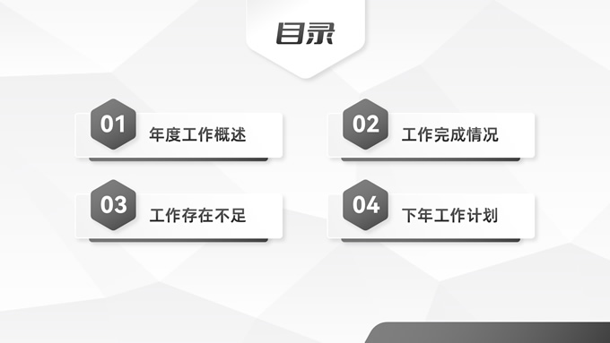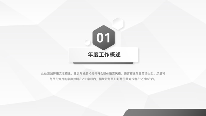 简介:经典灰微立体年度总结汇报ppt模板,本模板共23P,目录:年度工作概述、工作完成情况、工作存在不足、下年工作计划,淡雅灰低面风背景,微立体几何元素创意封面、目录页、过渡页,经典灰配色,微立体风格图表,简约素雅商务版式内容页,适合工作总结、工作汇报、工作计划等场景应用的微立体商务通用ppt模板。