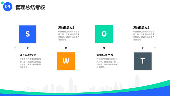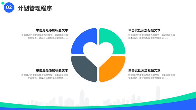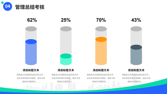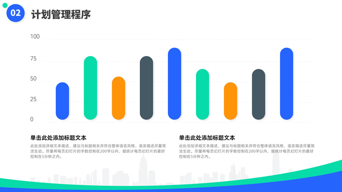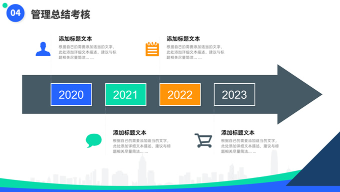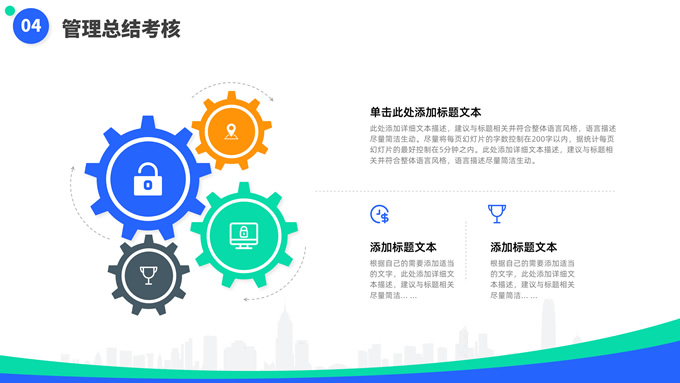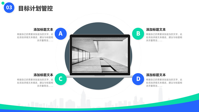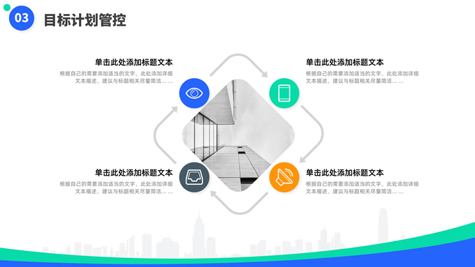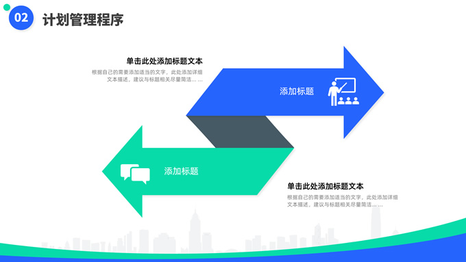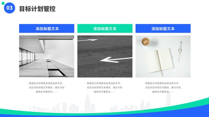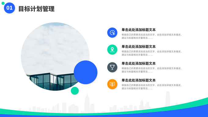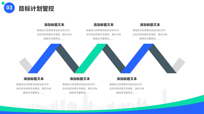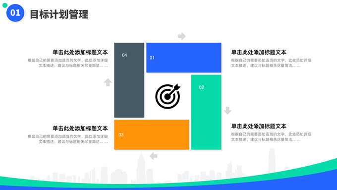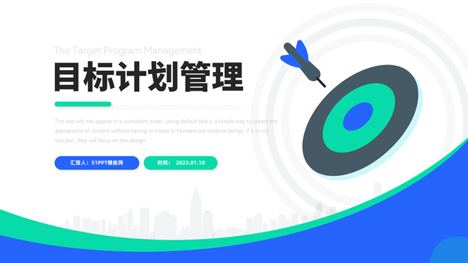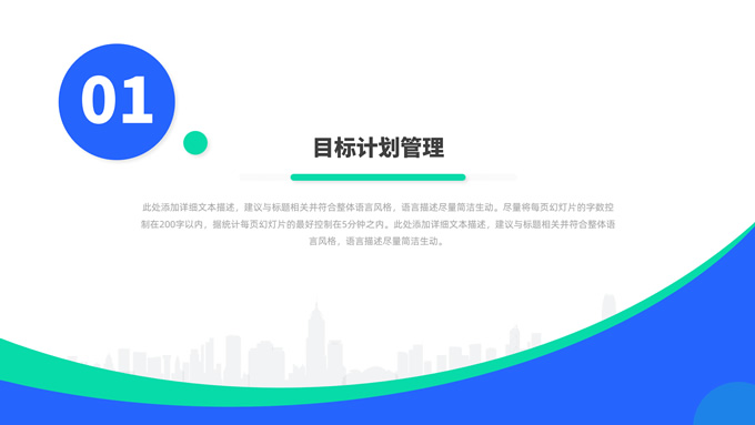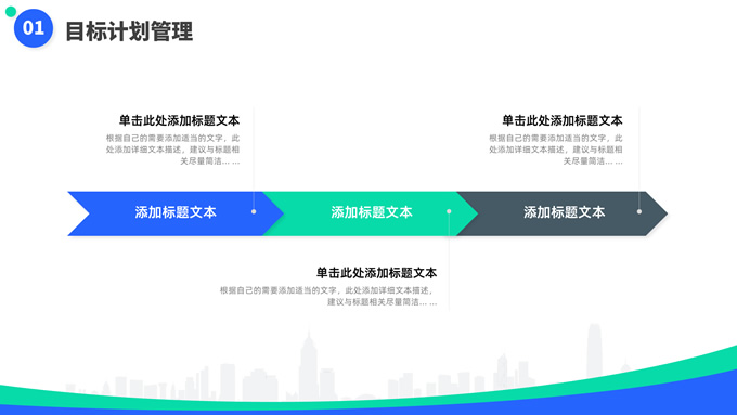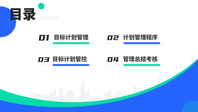 简介:蓝绿清新风目标计划管理商务培训ppt模板,本模板共23P,目录:目标计划管理、计划管理程序、目标计划管控、管理总结考核,箭头标靶主图,几何风标题文字封面、目录页、过渡页,蓝绿清新配色,扁平化图表,简约商务版式内容页,适合商务培训、项目汇报等场景应用的几何风商务通用ppt模板。