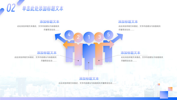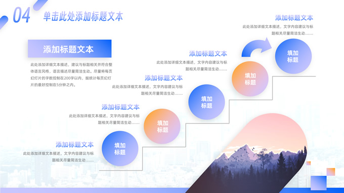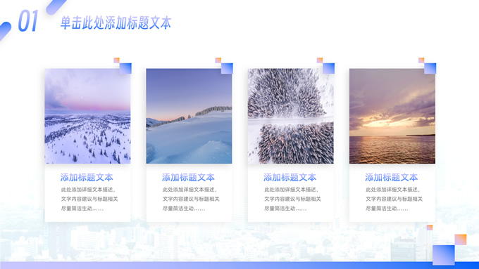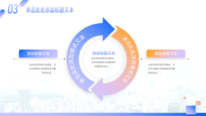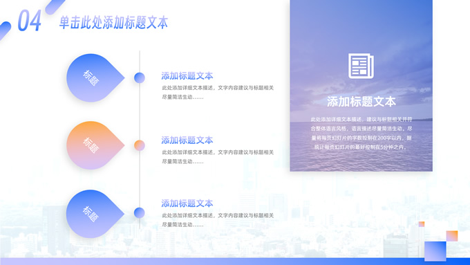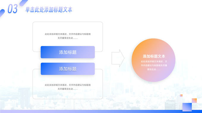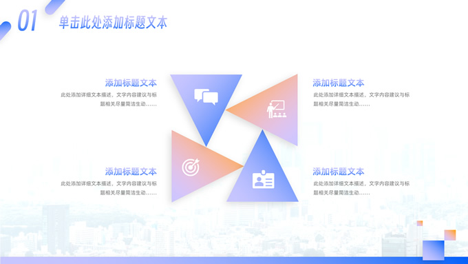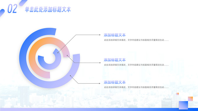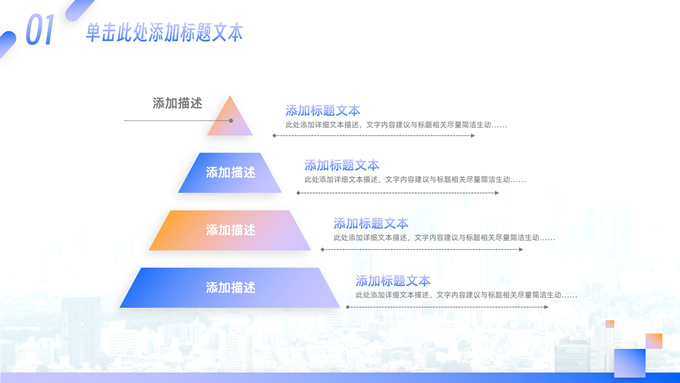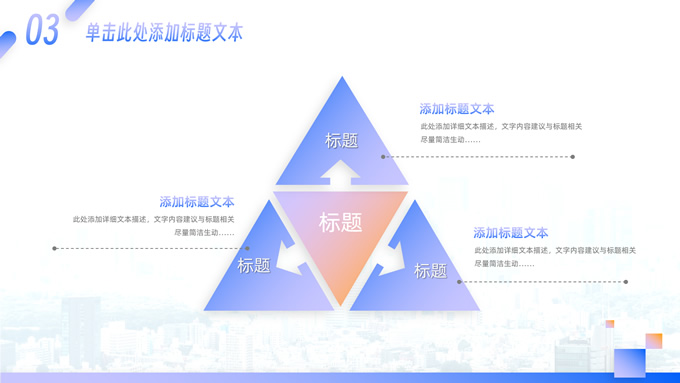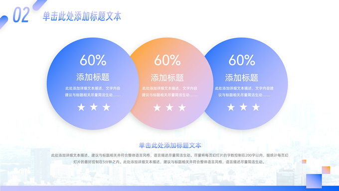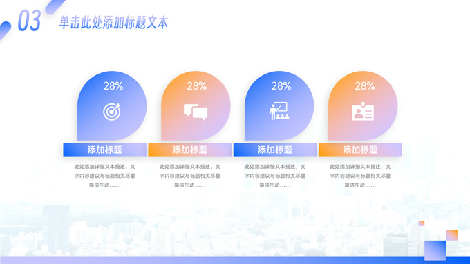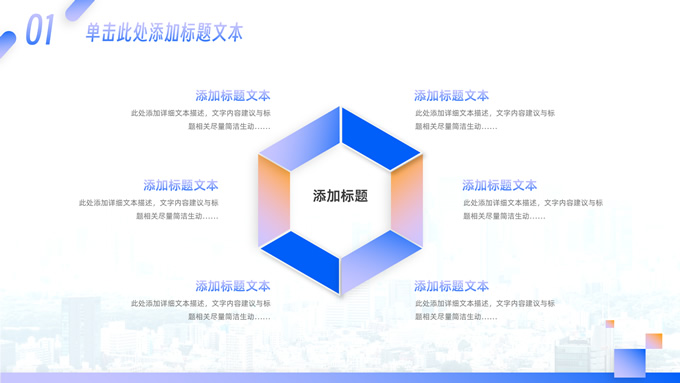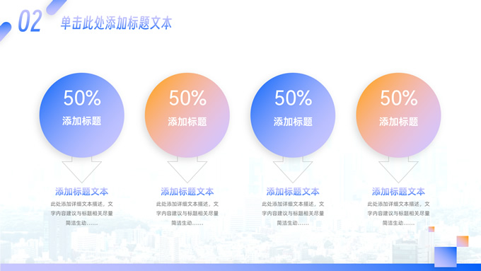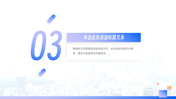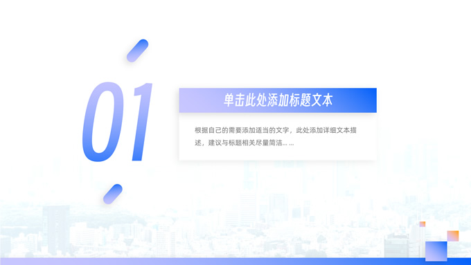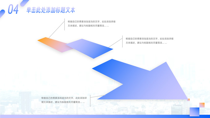 简介:渐变蓝简约几何风工作汇报商务通用ppt模板,本模板共23P,大城市蒙版大图背景,几何风标题文字封面、目录页、过渡页,蓝紫、橙紫渐变配色,阴影风格图表,简约清新风商务版式内容页,适合工作汇报、述职演示、竞职演讲、年终总结等场景应用的几何风商务通用ppt模板。