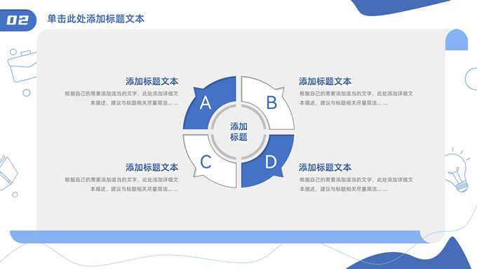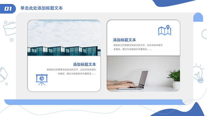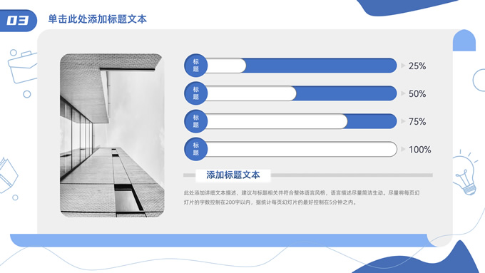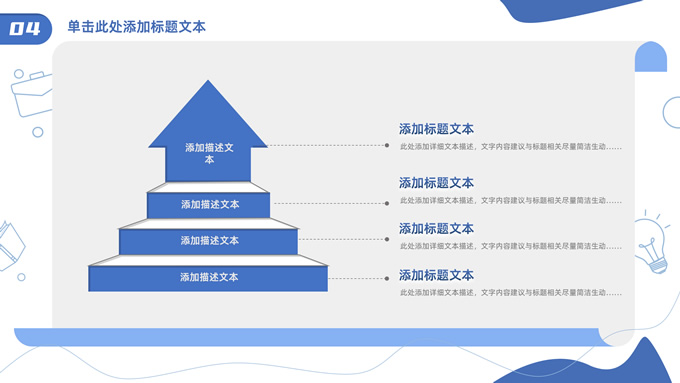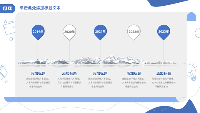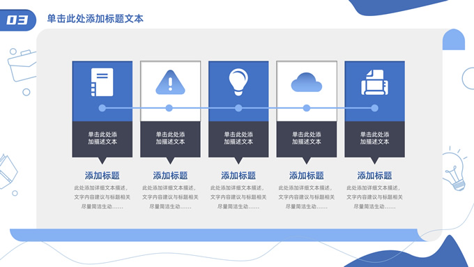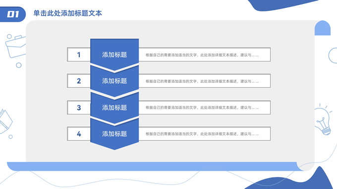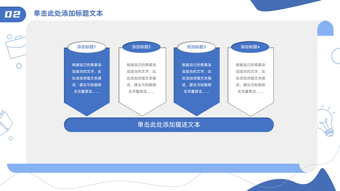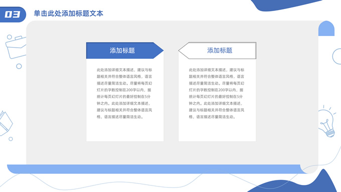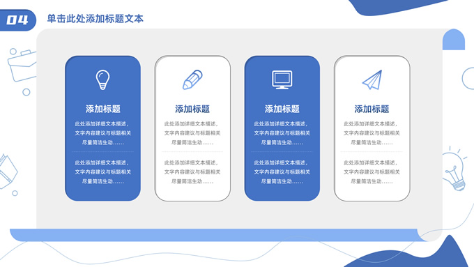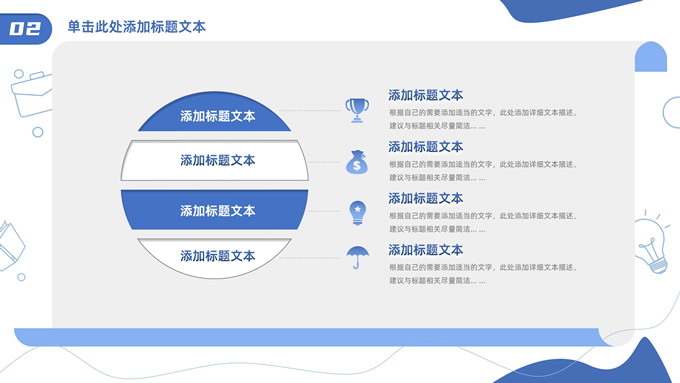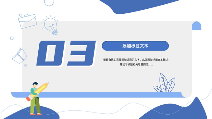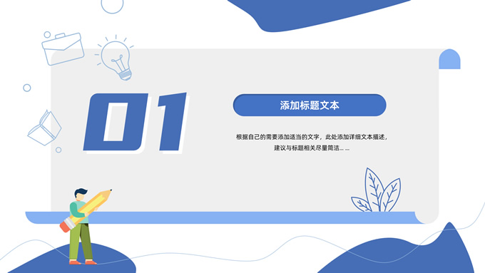 简介:卡通元素流体几何风年终总结ppt模板,本模板共23P,手绘图标、卡通插画、几何元素标题文字封面、目录页、过渡页,商务蓝配色,内测阴影风格图表,纸张卷形背景商务版式内容页,适合年终总结、工作总结、工作汇报、工作计划等场景应用的商务通用ppt模板。