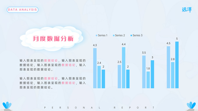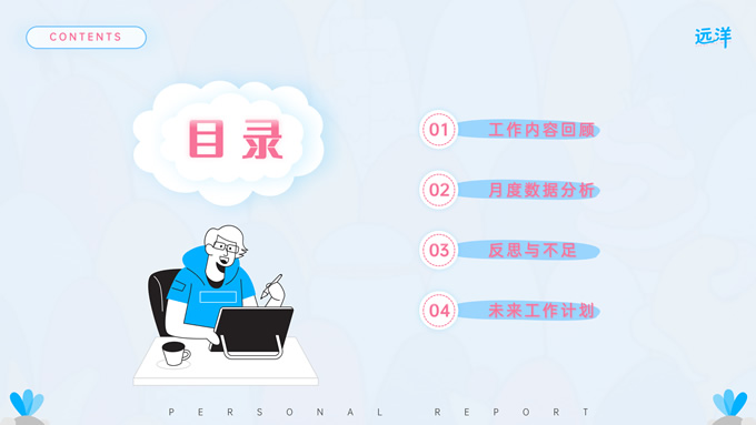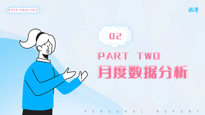 简介:蓝粉插画风个人工作汇报通用ppt模板,本模板共15P,里面包含了工作内容回顾、月度数据分析、反思与不足和未来工作计划等多种页面版式,适用于灵活场景的月度总结和工作规划,该套模板取自真实工作汇报场景,具有较为完善的框架以及极高的可编辑性,P界达人 远洋 作品。
