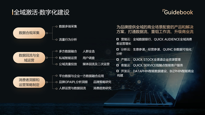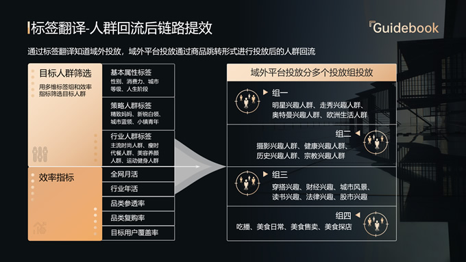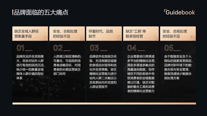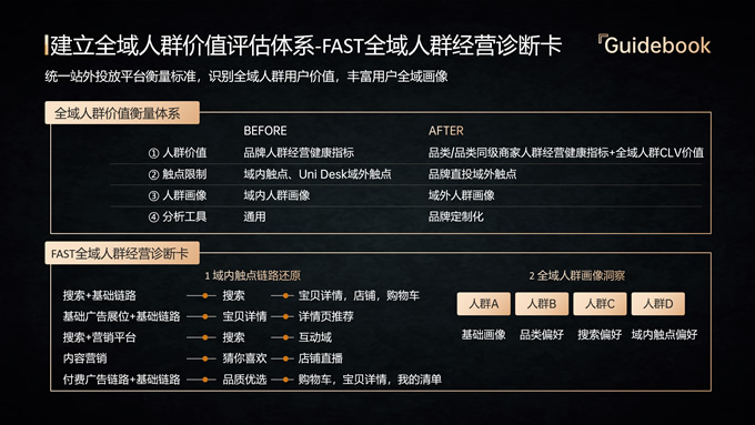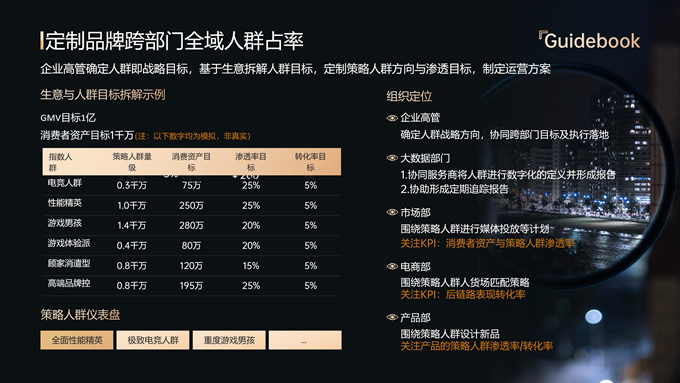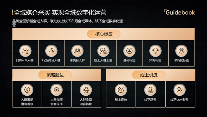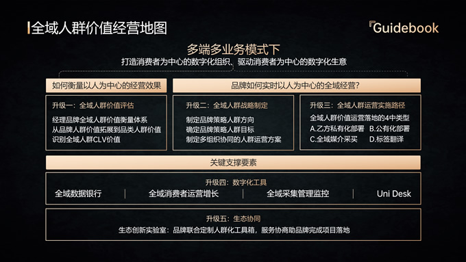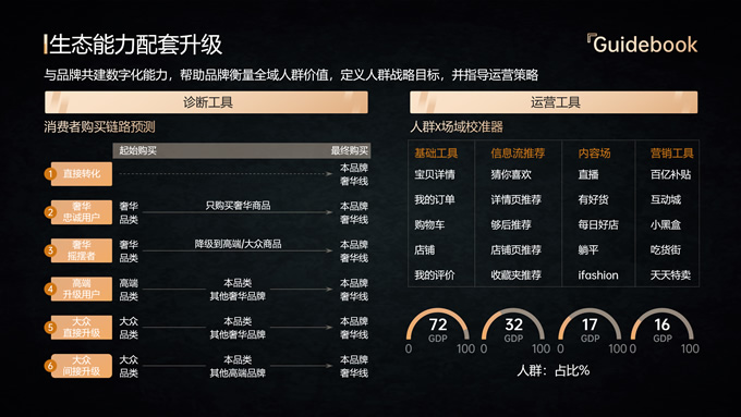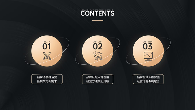 简介:品牌全域人群价值经营指南ppt模板,本模板共18P,内容包括趋势分析,场景应用,数据分析,大气黑金风格扁平化设计,模板版式包括文字段落页、图文版式页、图表版式页、特殊功能页等,适合商业报告总结展示等场景,P界达人 六白 作品。