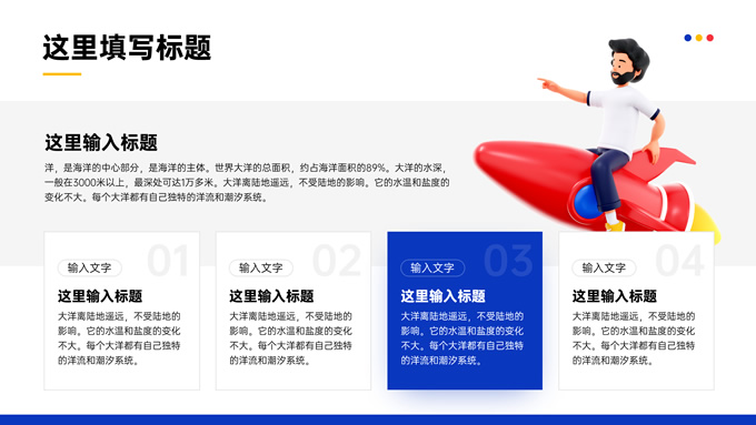 简介:3D插画流行元素蓝色商务通用ppt模板,本模板共10P,模板选择蓝色做为主色调,选择当下流行的3D素材进行页面设计,整体页面呈现更具视觉吸引力,同时画面具有立体感,包含图文页、表格页、数据图表页、流程图页等,模板版式多样化,适应不同的商务场景,P界达人 kira 作品。