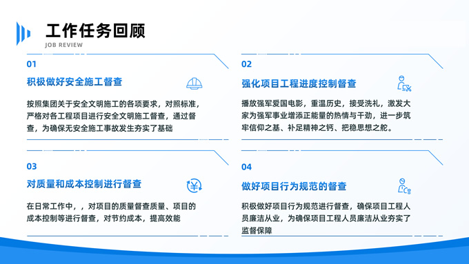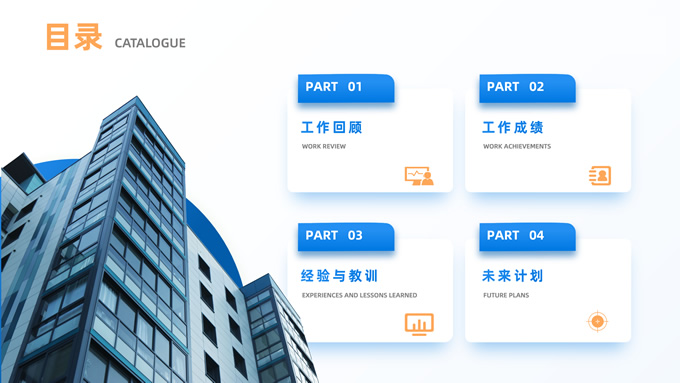 简介:简洁实用商务风季度工作汇报ppt模板,本模板共30P,淡蓝背景,对角圆角矩形几何风封面、目录页、过渡页,蓝白配色,仰视视觉商务高楼背景,阴影风格图表,简洁商务风版式内容页,适合工作总结、工作汇报、工作计划等场景应用的季度总结汇报商务通用型ppt模板,P界达人 大葱君 作品。