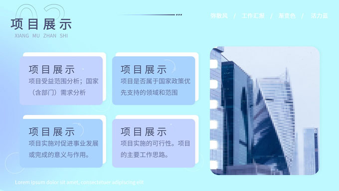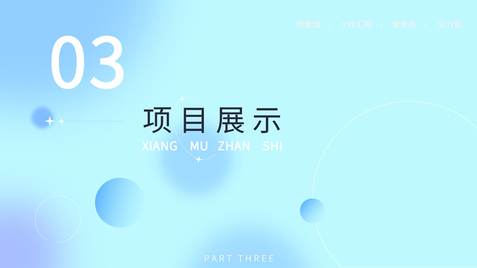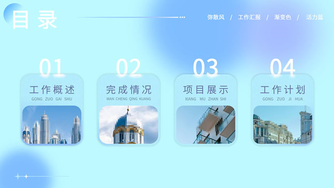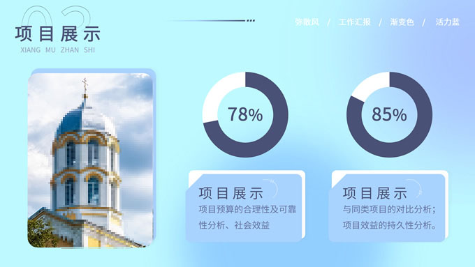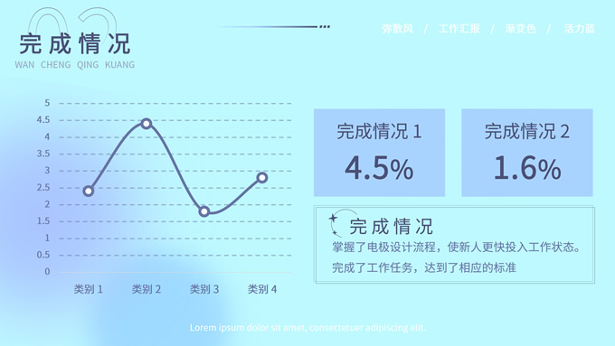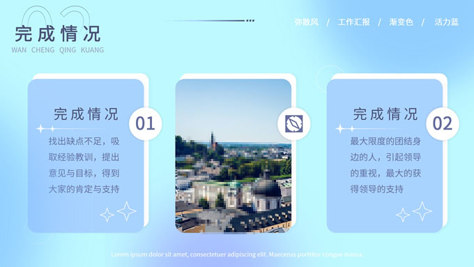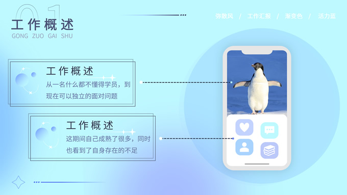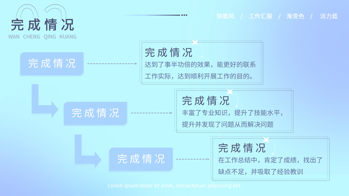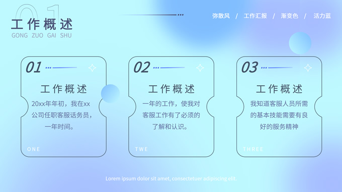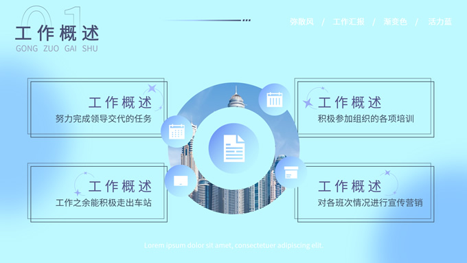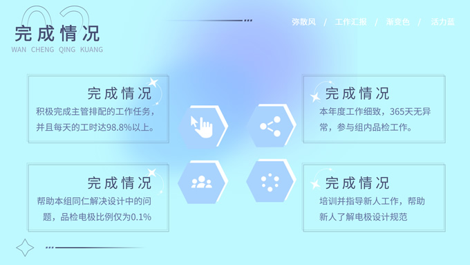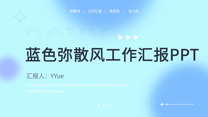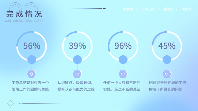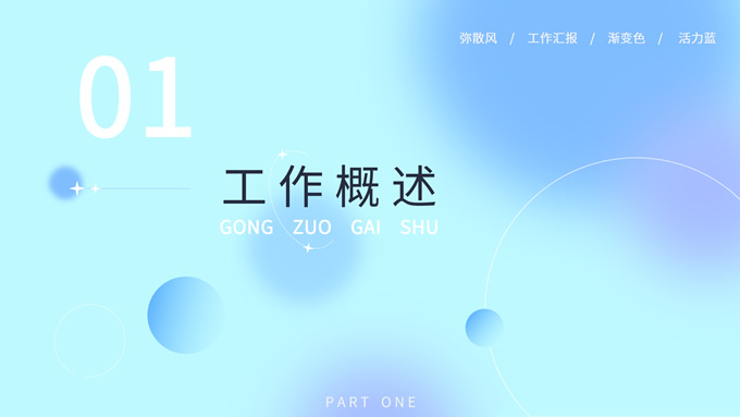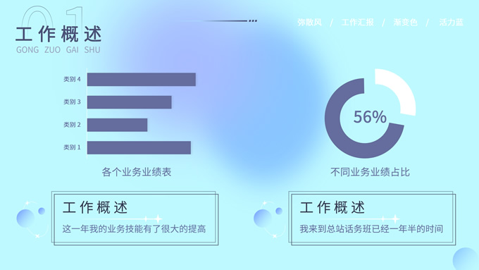 简介:蓝色弥散风工作汇报商务通用ppt模板,本模板共30P,涵盖了封面页、目录页、过渡页和内容页,内容页包含各种逻辑关系页以及三种图表页,版式丰富,本套作品是新潮设计风格,设计灵感来源于花瓣弥散风,浅色系风格给人一种轻松明亮的感觉,晕染的蓝紫色光圈丰富了页面颜色,此份模板可用于工作汇报、年度总结、工作述职等场合,P界达人 YYue 作品。