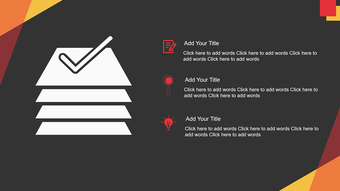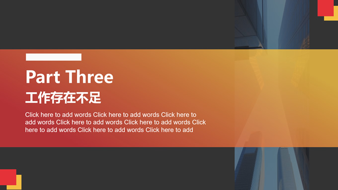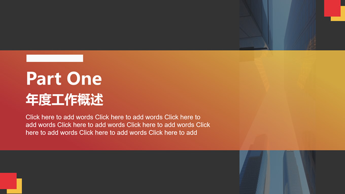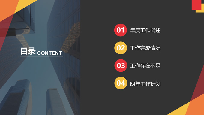简介:几何风年终总结汇报商务通用ppt模板,本模板共17P,目录:年度工作概述、工作完成情况、工作存在不足、明年工作计划,仰视图商务高楼背景,几何元素几何风简约封面、目录页、过渡页,红黄配色,扁平化图表,商务通用版式内容页,适合年终总结、工作汇报等场景应用的几何风商务通用ppt模板。