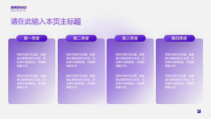 简介:磨砂玻璃质感紫色商务年中总结ppt模板,本模板共11P,整体以紫色渐变为主色调,有别于市面上传统的蓝色风格,可以根据自身的内容来挑选页面使用,将内容输入到相应板块即可,所有内容可编辑,图片可替换,适合年中总结、工作汇报、工作计划等场景应用的商务通用ppt模板,P界达人 彬少 作品。
