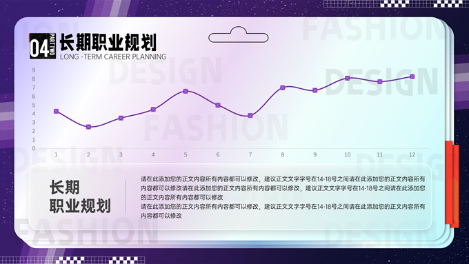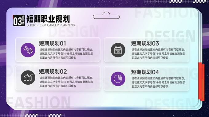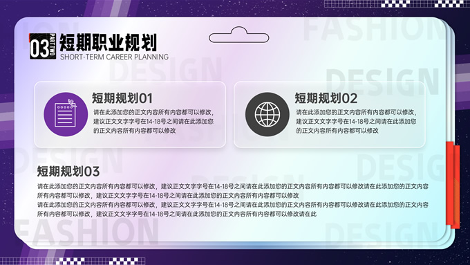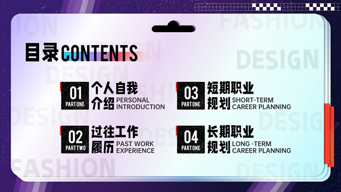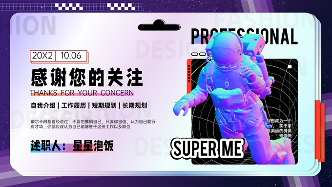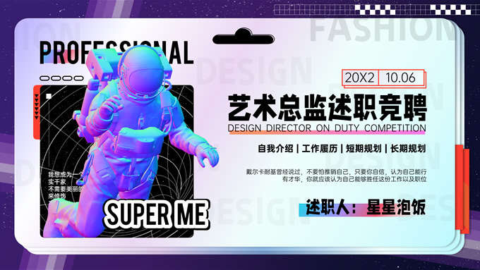 简介:新潮风格艺术总监述职竞聘ppt模板,本模板共10P,目录:个人自我介绍、过往工作履历、短期职业规划、长期职业规划,这套模板是作者日常练习ppt模板,涵盖了封面页,封尾页,目录页,过渡页,和正文页等,本套设计创意借鉴了花瓣上一些好看的banner和H5图片,把几种相同风格图片结合起来重新创作出来现在的这个作品,希望这套作品能给你带来灵感和启发,P界达人 星星泡饭 作品。