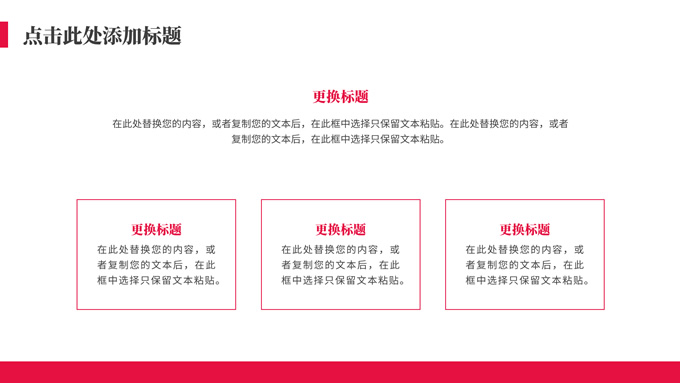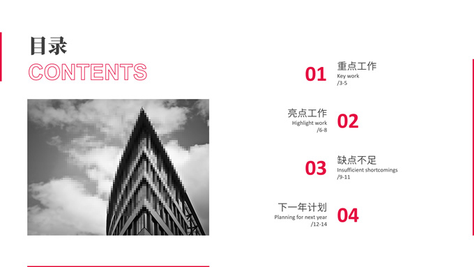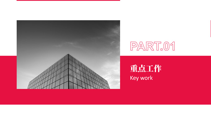 简介:红白极简商务工作总结汇报ppt模板,本模板共15P,红白配色,扁平商务风,包含封面页、目录页、过渡页、内容页、图表页等功能页面,文字、图表、图片可编辑替换,主题配色字体可一键更换,适合总结汇报、企业介绍、职场演示等场景的应用,P界达人 水母君 作品。