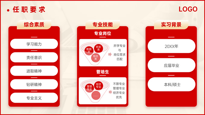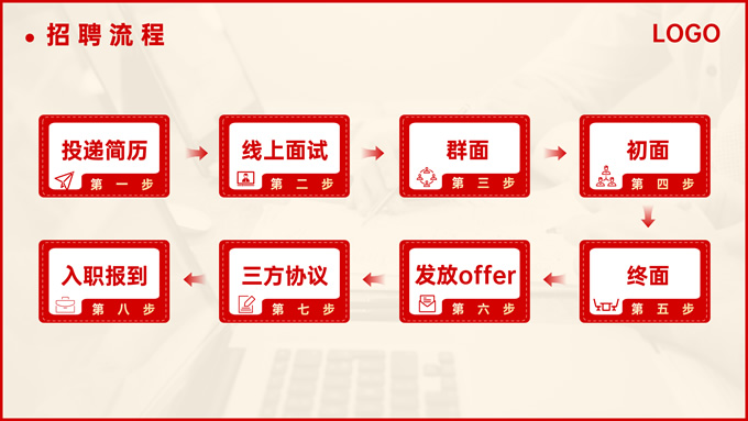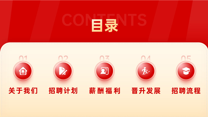 简介:热烈红校园招聘主题ppt模板,本模板共18页,分为5个部分:关于我们、招聘计划、薪酬福利、晋升发展、招聘流程,涵盖了封面页版式、目录页版式、章节页版式、内容页版式,整个ppt以红色、金色为主题色,彰显了同学们在校园的青春活力,封面为一张开封的请柬,切合招聘的主题,文案内容也非常详实,完全可以作为企业招聘宣讲的内容参考,此套ppt模板可以用于校园招聘、企业招聘等场景,P界达人 熊猫 作品。