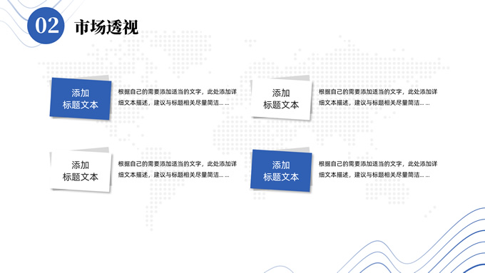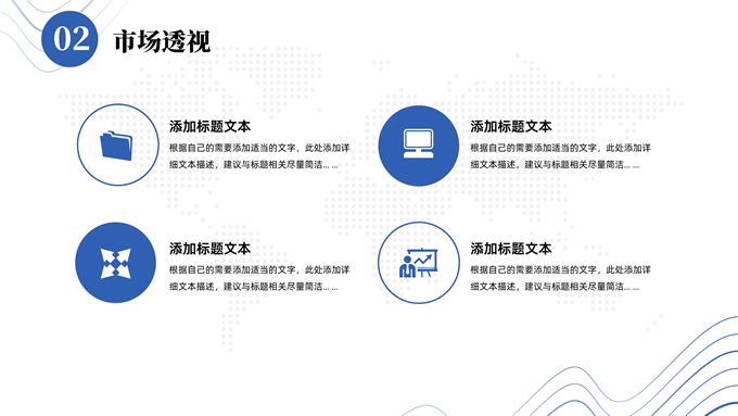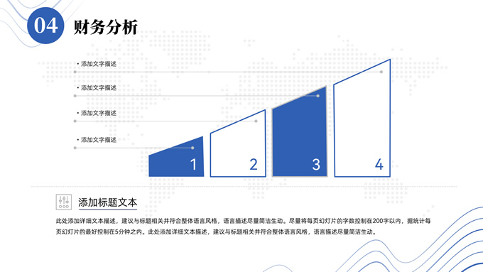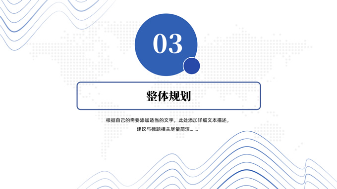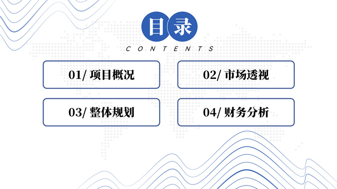 简介:抽象山峰线条极简商业计划书ppt模板,本模板共23P,目录:项目概况、市场透视、整体规划、财务分析,浅灰网点世界地图背景,抽象山峰线条几何圆创意封面、过渡页,商务蓝配色,扁平化极简版式内容页,适合项目推介、商业计划、工作计划等场景应用的极简计划书ppt模板。