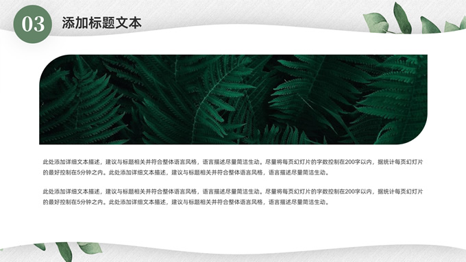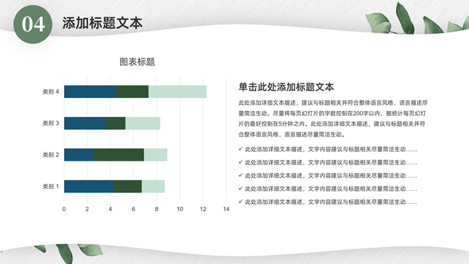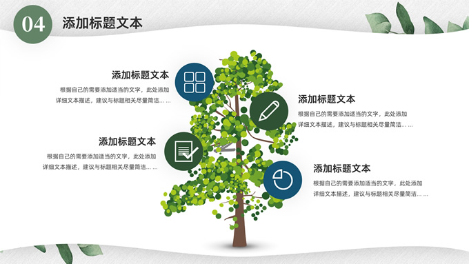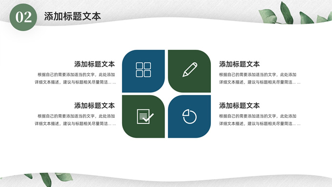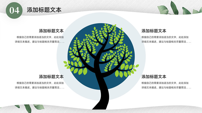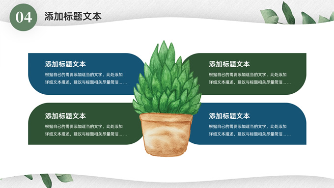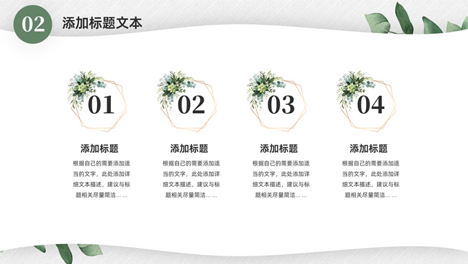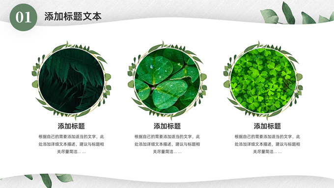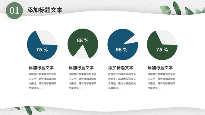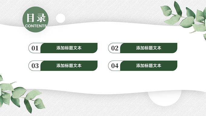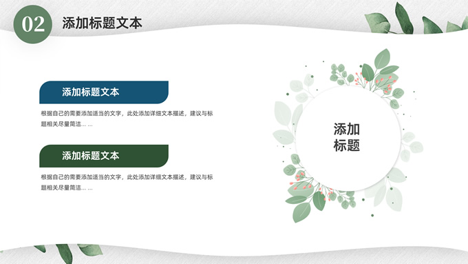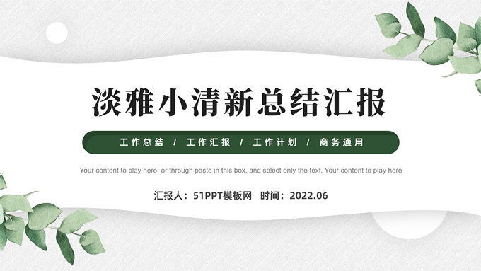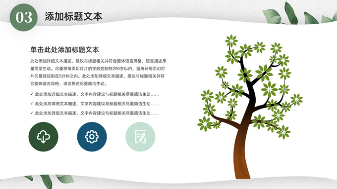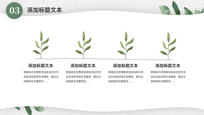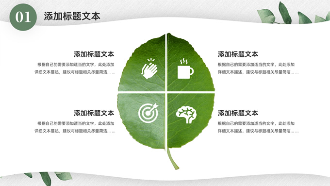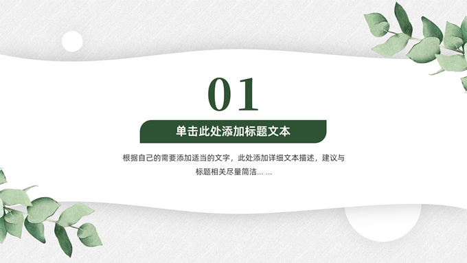 简介:淡雅小清新总结汇报商务通用ppt模板,本模板共23P,水彩叶子主图,简约几何风标题文字封面、目录页、过渡页,小清新绿配色,扁平化图表,枝叶、树、绿叶图片配图简约清新风版式内容页,适合工作总结、工作汇报等场景应用的简约商务通用ppt模板。