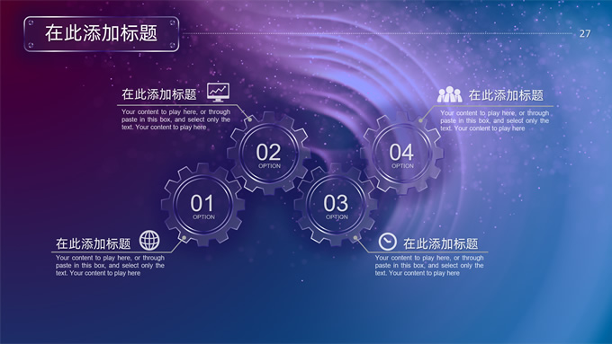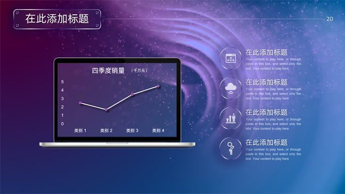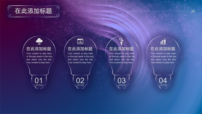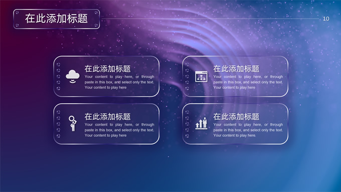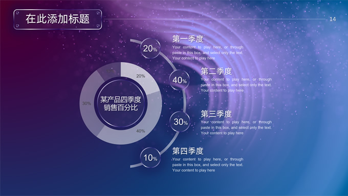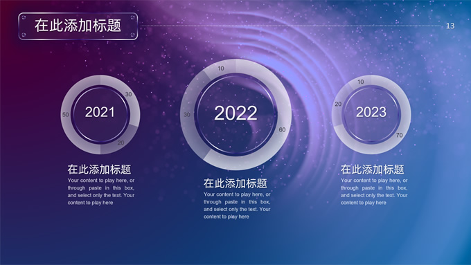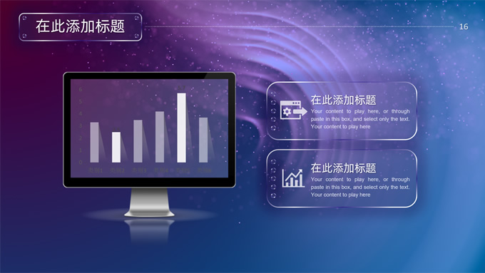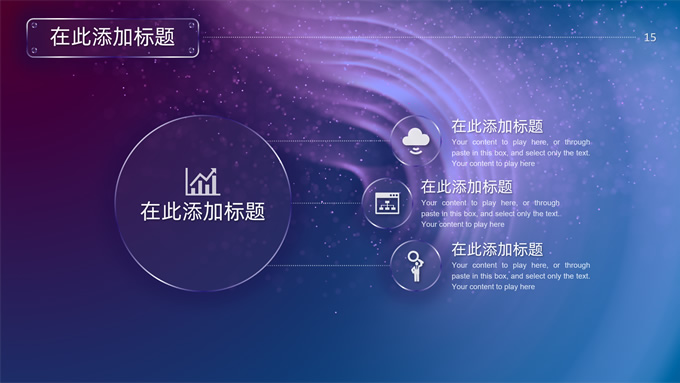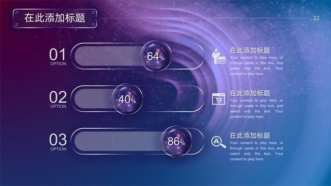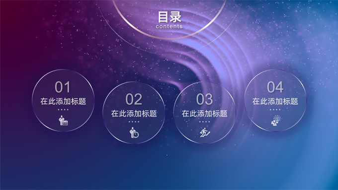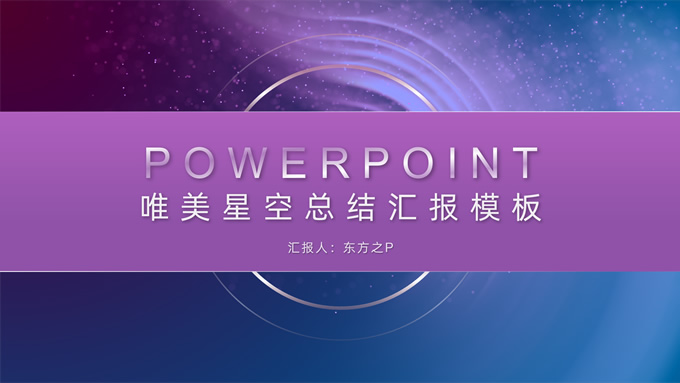 简介:唯美星空总结汇报商务ppt模板,本模板共32P,唯美炫丽蓝紫星空背景,半透明渐变圆环、矩形标题文字封面、目录页、过渡页,半透明图表,ios风格简约版式内容页,适合工作总结、工作汇报等场景应用的星空系列商务通用ppt模板。