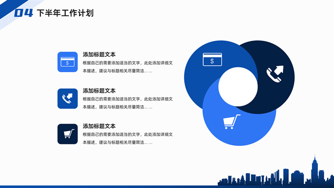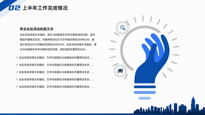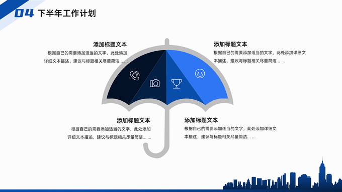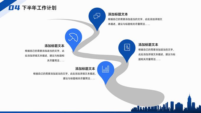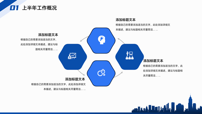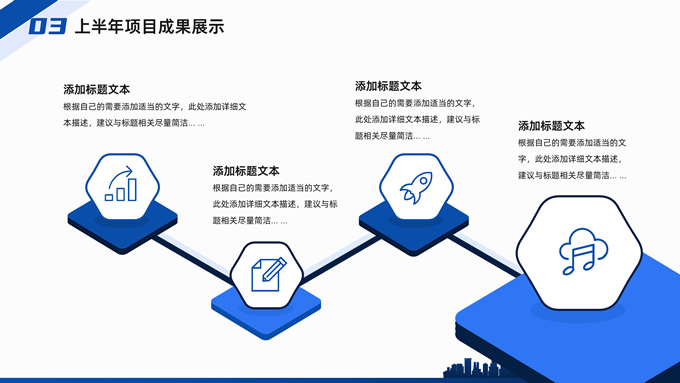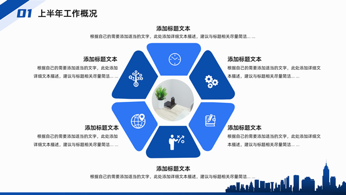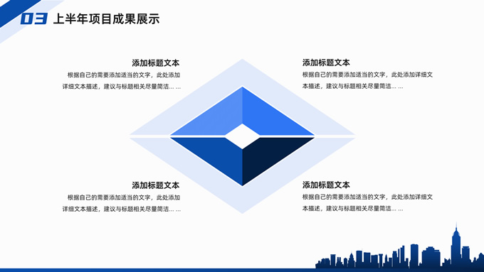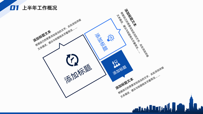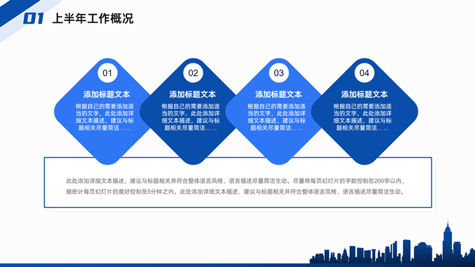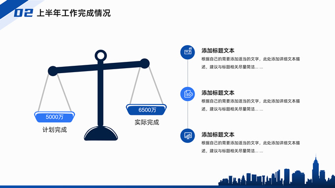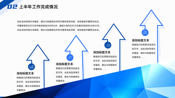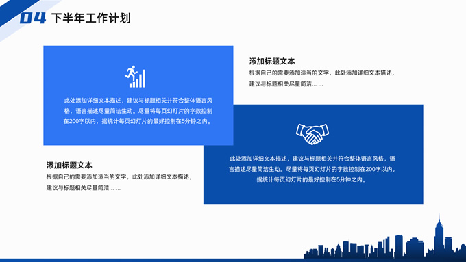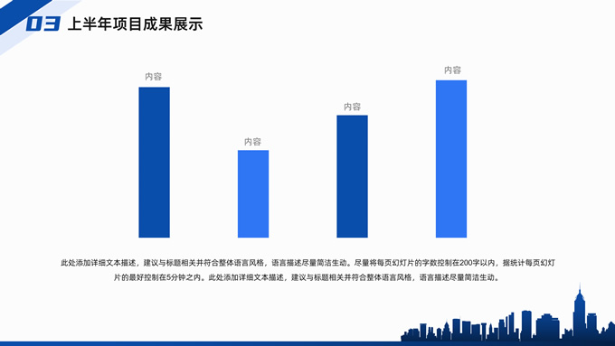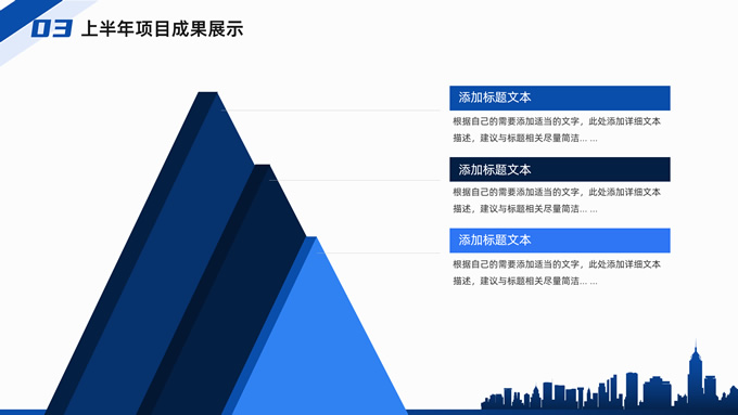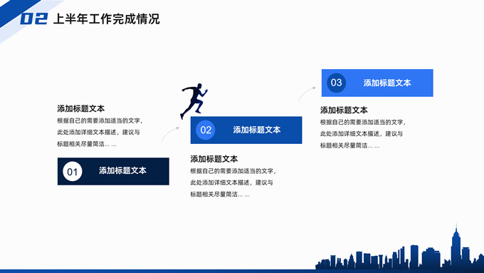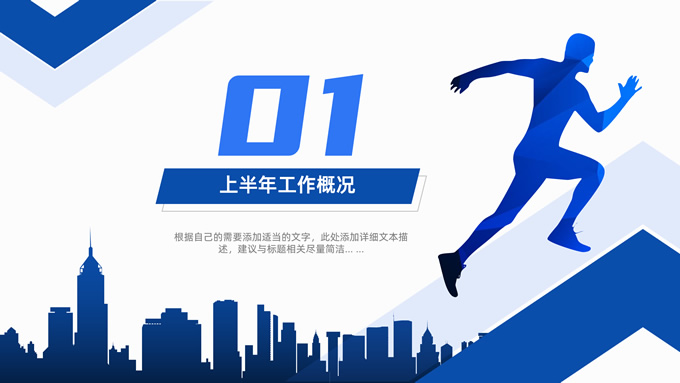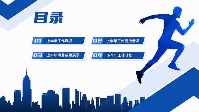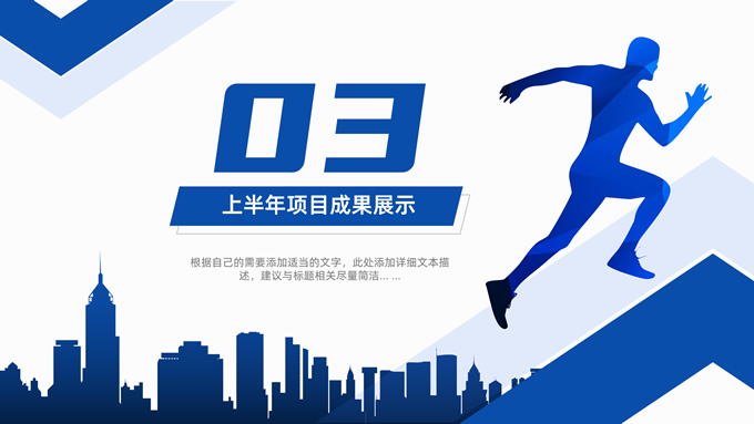 简介:商务蓝几何风年中工作汇报ppt模板,本模板共23P,目录:上半年工作概括、工作完成情况、项目成果展示、下半年工作计划,奔跑的人物、城市剪影,三角形几何风标题文字封面、目录页、过渡页,商务蓝配色,扁平化图表,极简约商务风版式内容页,适合半年工作总结、年中工作汇报等场景应用的商务通用ppt模板。