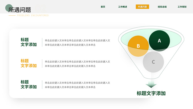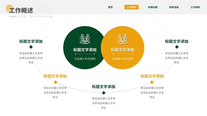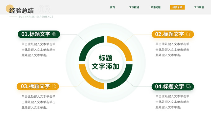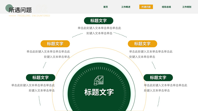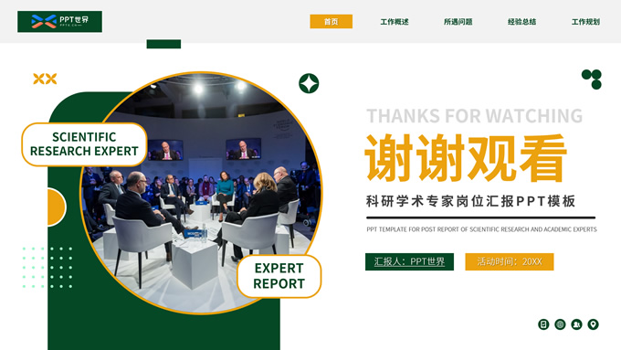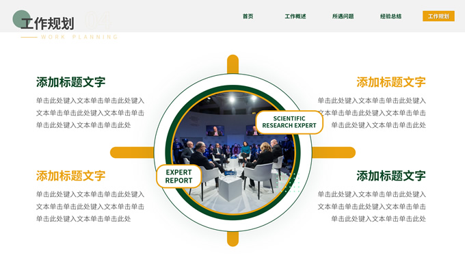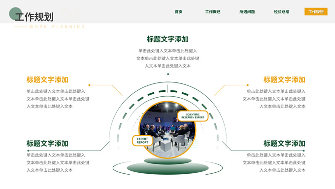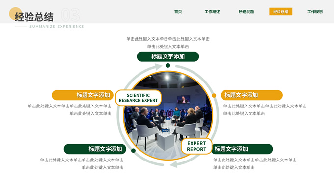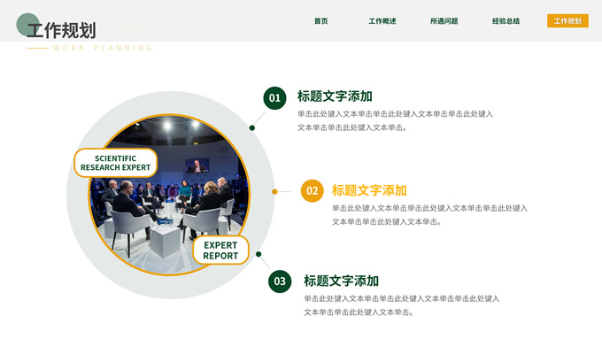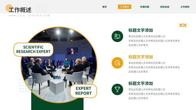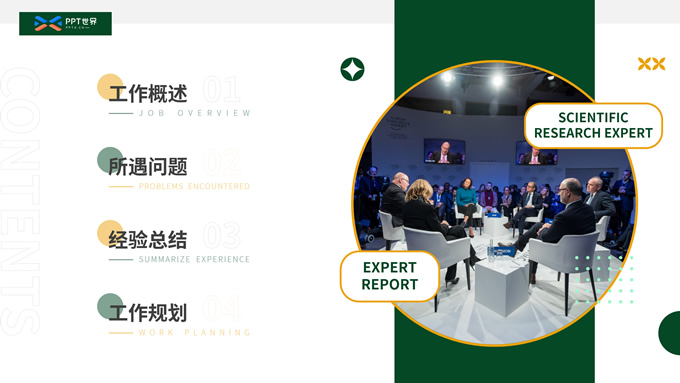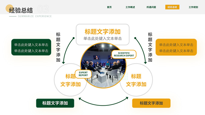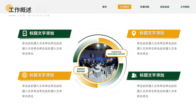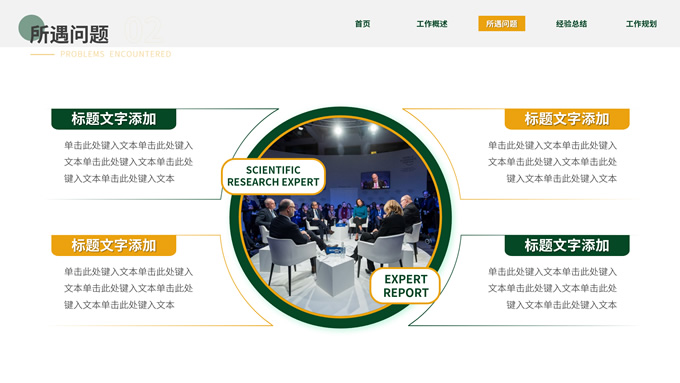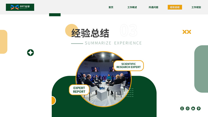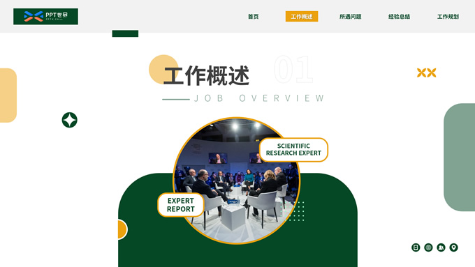 简介:科研学术专家岗位汇报ppt模板,本模板共19P,目录:工作概述、所遇问题、经验总结、工作规划,简约时尚几何风封面、目录页、过渡页,绿黄配色,仿网页导航切换网页风版式内容页,适合工作汇报、岗位汇报、学术总结等场景应用的科研学术专家总结汇报通用ppt模板。