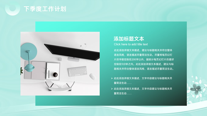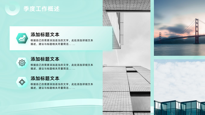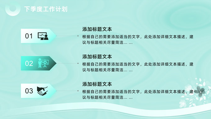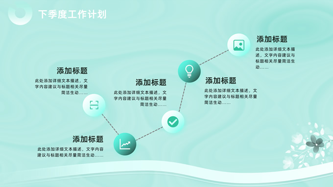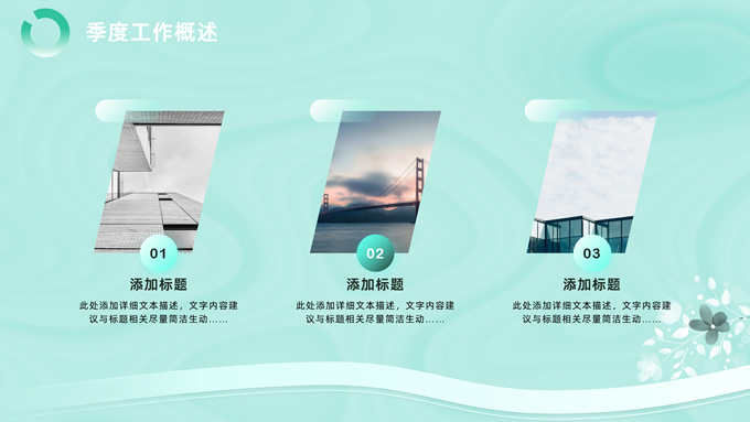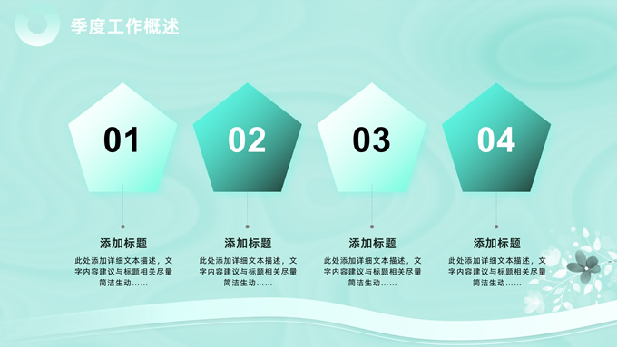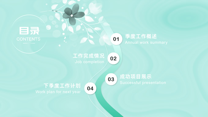 简介:淡雅绿清新几何风季度总结汇报商务通用ppt模板,本模板共19P,目录:季度工作概述、工作完成情况、成功项目展示、下季度工作计划,淡雅绿背景,水彩植物花卉几何图形线条几何风封面、目录页、过渡页,渐变绿配色,简约清新风商务版式内容页,适合季度工作总结、工作汇报、工作计划等场景应用的清新几何商务通用ppt模板。