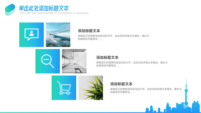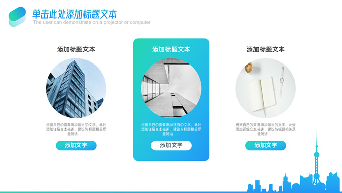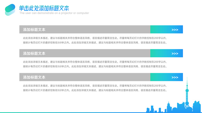 简介:卡片式几何风企业总结汇报商务通用ppt模板,本模板共25P,商务大图背景,城市剪影、卡片式矩形框几何风标题文字封面、目录页、过渡页,蓝绿渐变配色,扁平化图表,简约清新商务风版式内容页,适合工作总结、工作汇报、述职演示、公司推介等场景应用的几何风商务通用ppt模板。