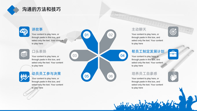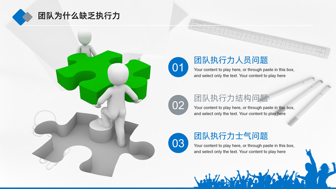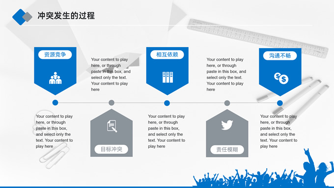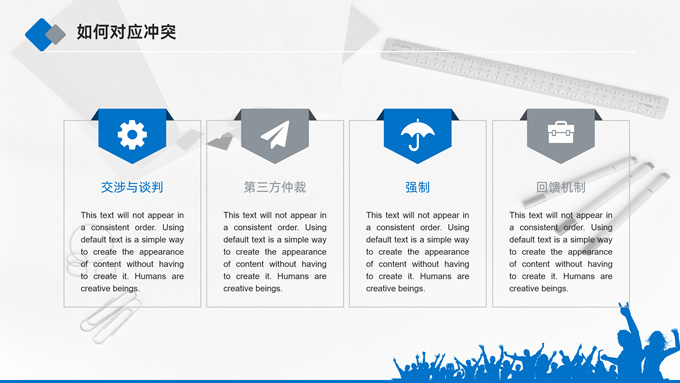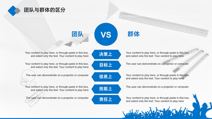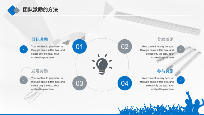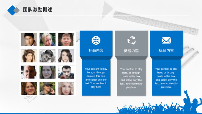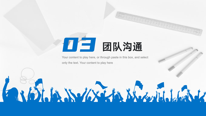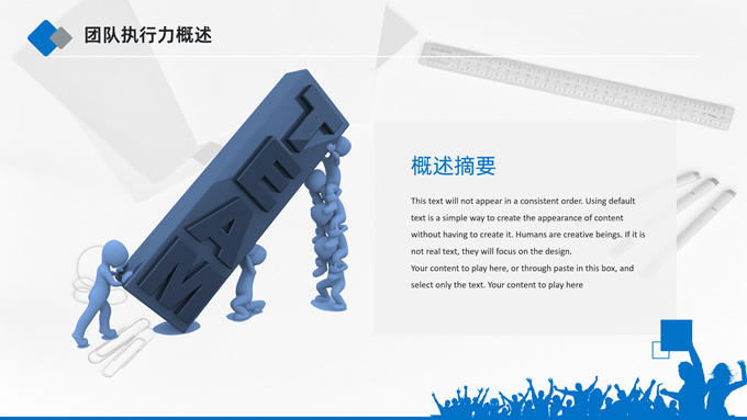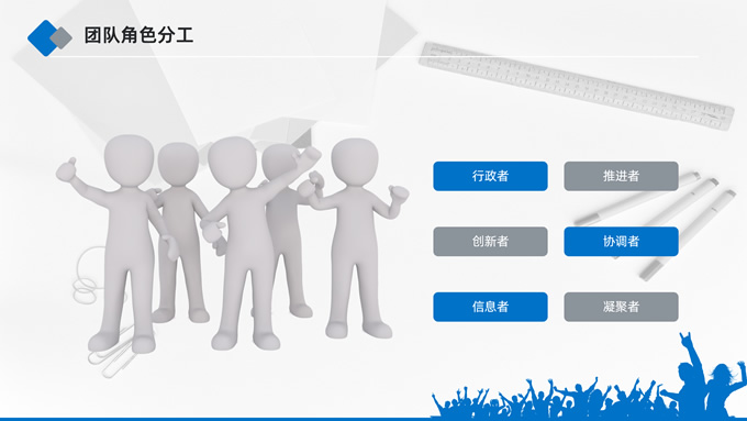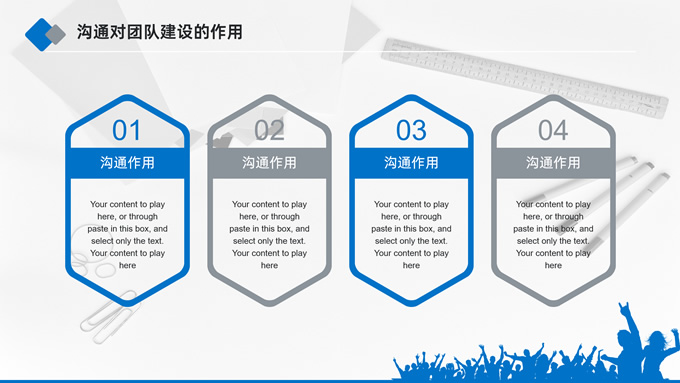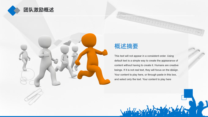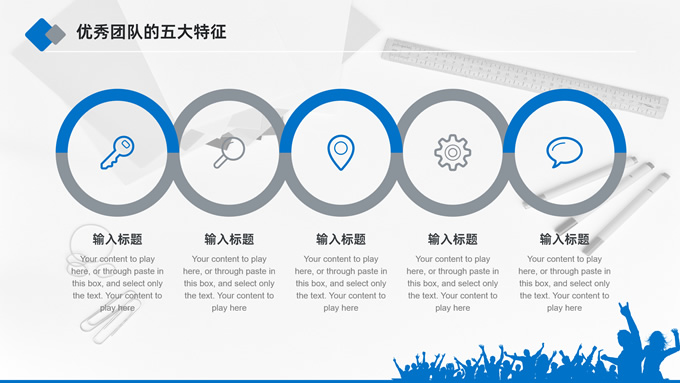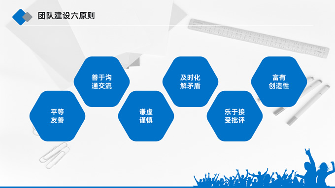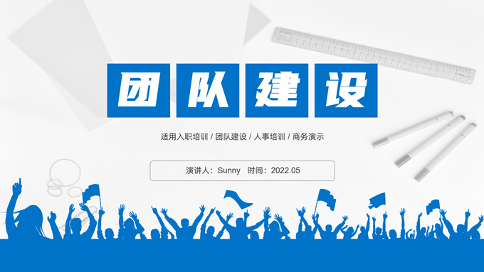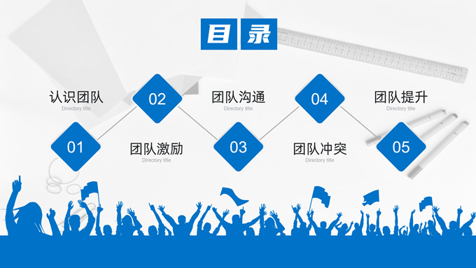 简介:团队建设企业内部人事培训ppt模板,本模板共26P,目录:认识团队、团队激励、团队沟通、团队冲突、团队提升,淡雅灰商务桌面背景,团队人物胜利欢呼剪影标题文字封面、目录页、过渡页,蓝灰配色,扁平化图表,完整框架商务版式内容页,适合入职培训、人事培训、企业内训等场景应用的团队建设通用ppt模板。