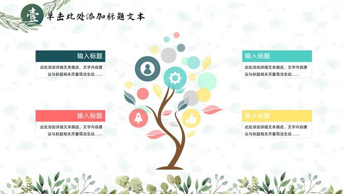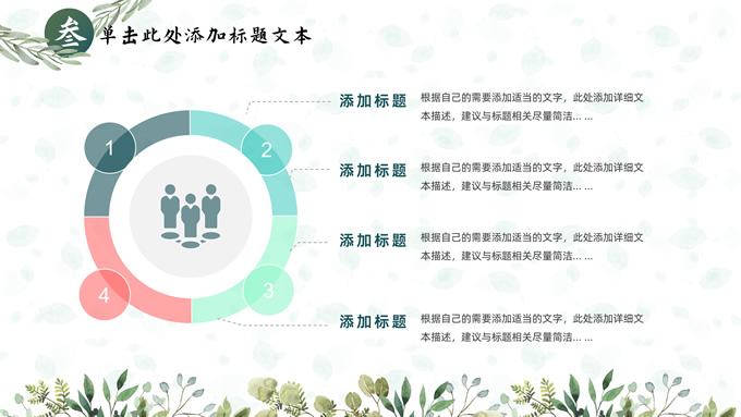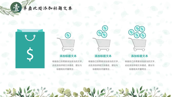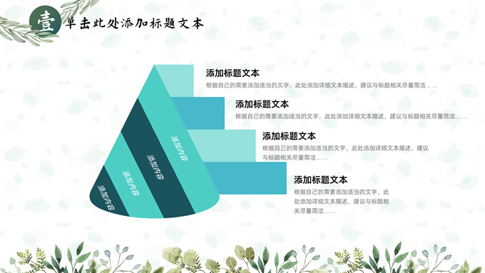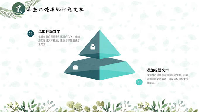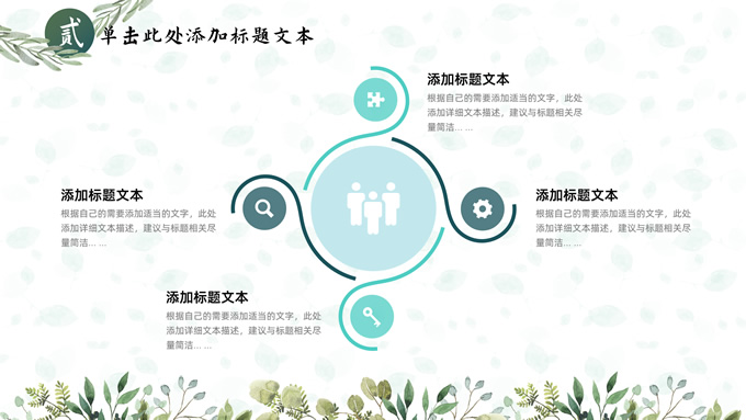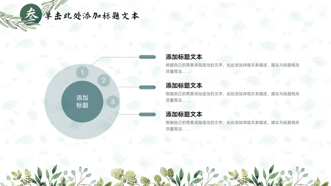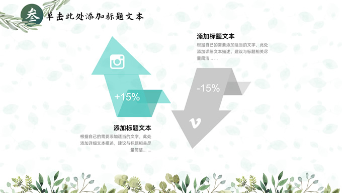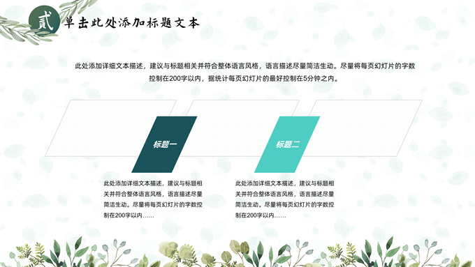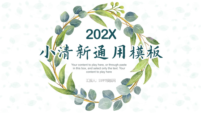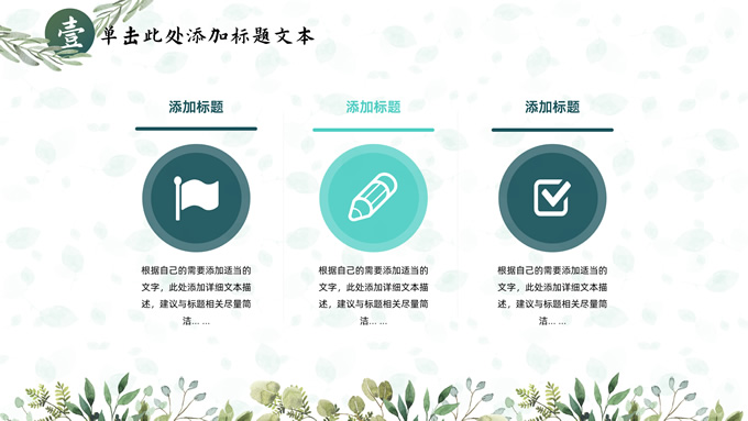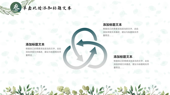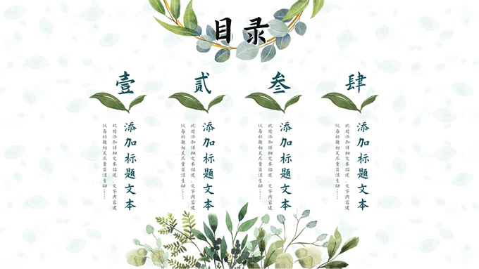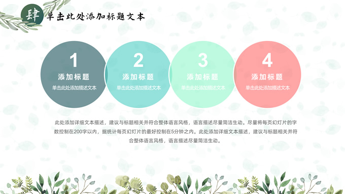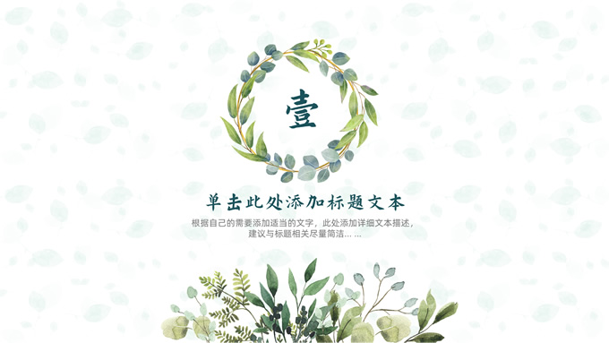 简介:叶子花环文艺清新总结汇报商务通用ppt模板,本模板共25P,淡雅绿叶背景,叶子花环主图标题文字封面、目录页、过渡页,绿色清新风配色,极简文艺风版式内容页,适合工作总结、工作汇报、述职演示等场景应用的文艺风商务通用ppt模板。
