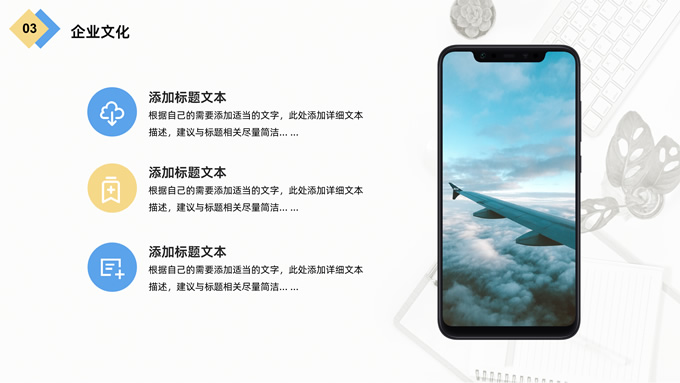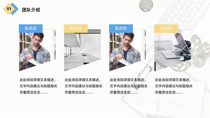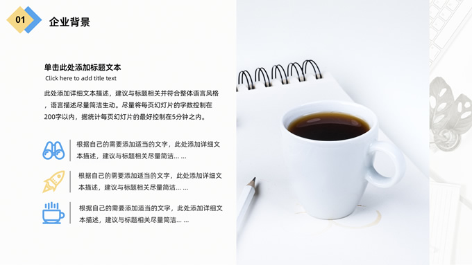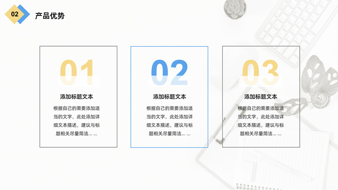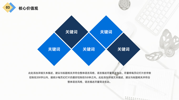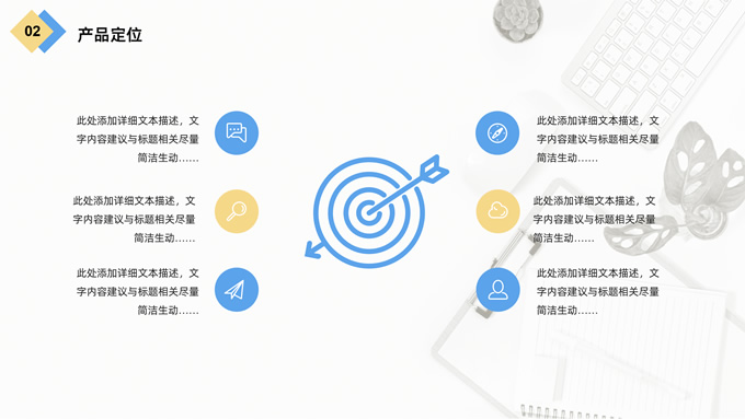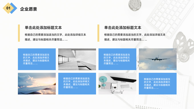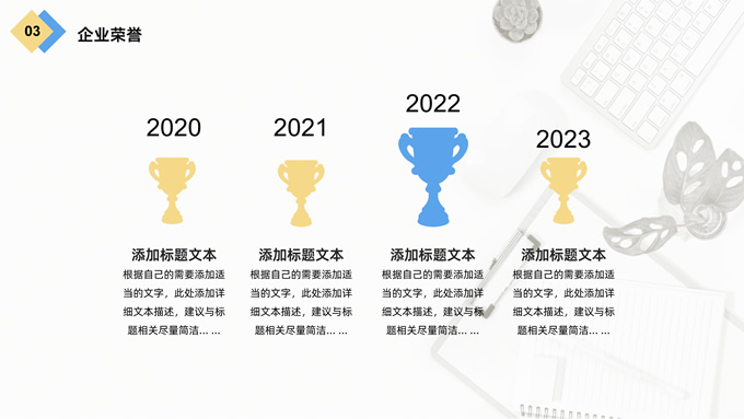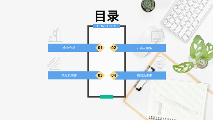 简介:简洁休闲商务风企业介绍ppt模板,本模板共22P,目录:企业介绍、产品及服务、文化及荣誉、规划及未来,办公桌面场景背景,矩形线框几何风标题文字封面、目录页、过渡页,蓝黄清新配色,扁平化图表,简约休闲商务版式内容页,适合企业介绍、品牌宣传、项目汇报、商务谈判等场景应用的商务通用ppt模板。